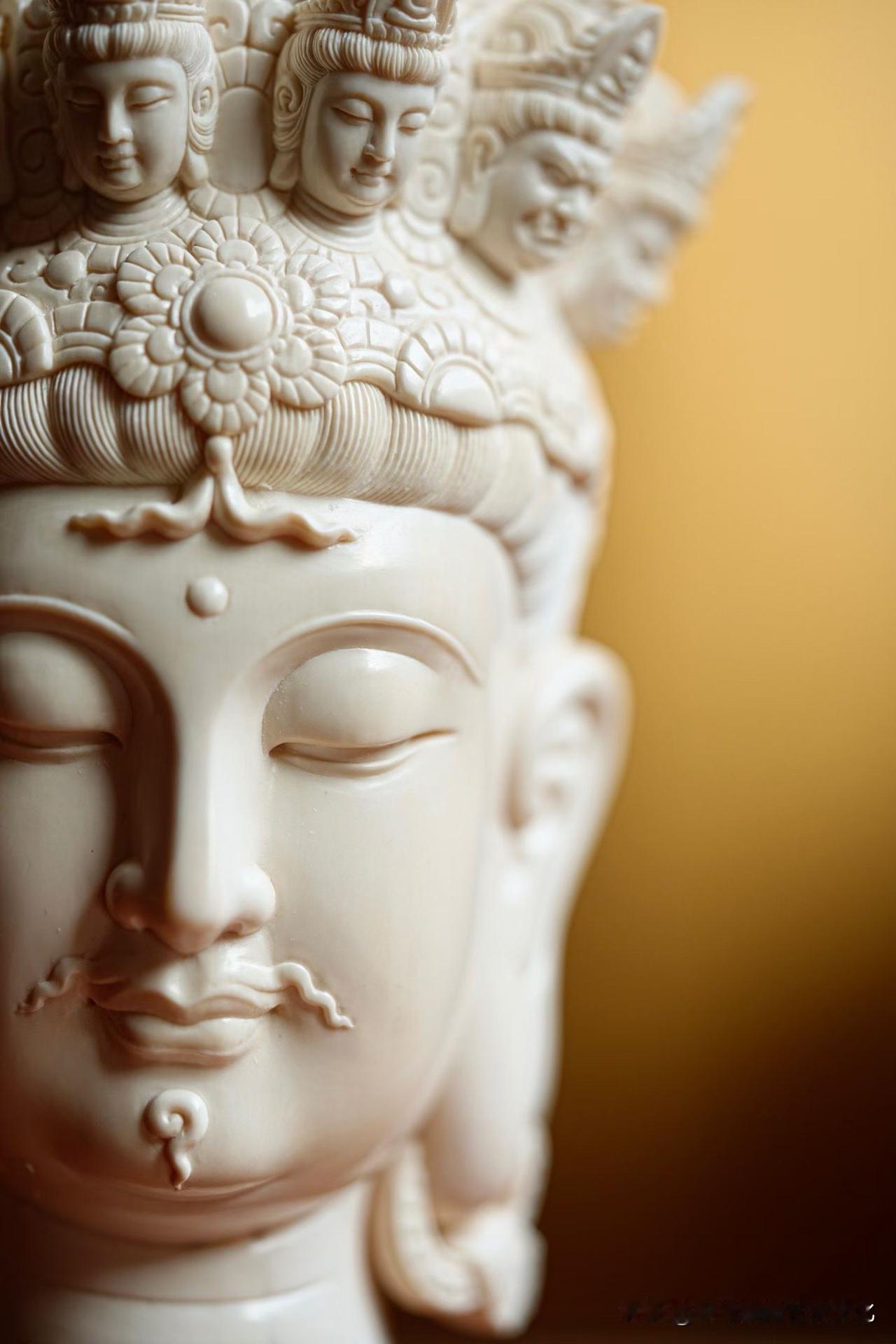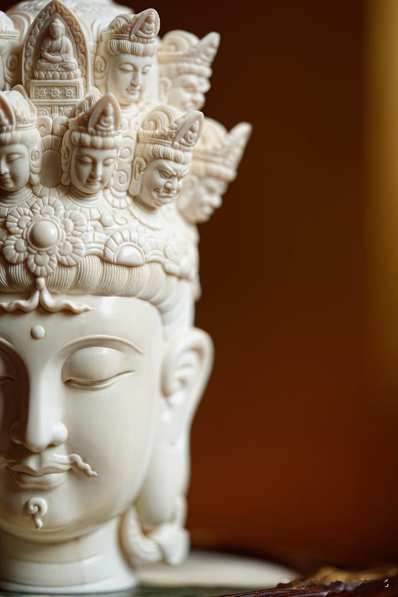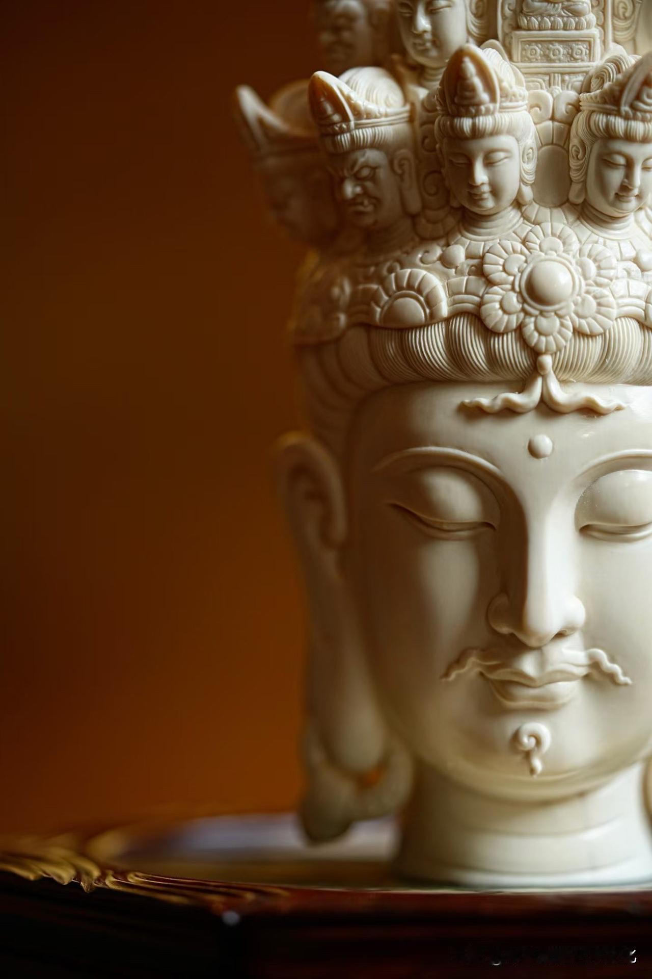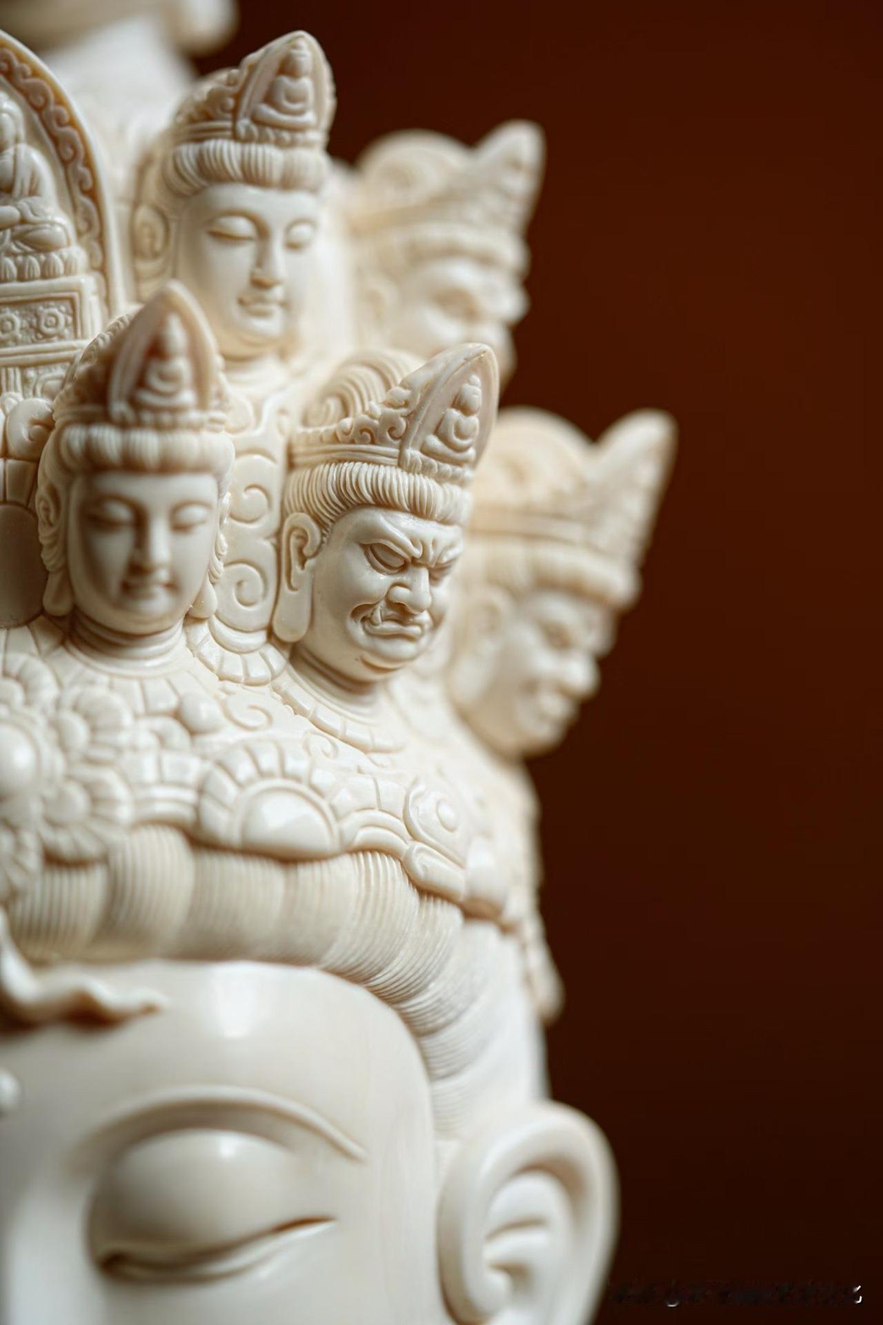 猛犸象牙|十一面观音 有些“多”,是为了回到“一”。 一面安静,十面众生。 慈、威、静、怒,层层叠起,不是复杂,而是把人心的种种,都收在一处。 材质温润如凝脂, 刀工却克制到极致—— 该细的地方入微,该收的地方不多一笔。 看久了,会发现它不只是“多面”, 而是在慢慢把心拉回一个点。 你觉得这样的造像, 是工艺更打动人,还是那份安定感更重要?