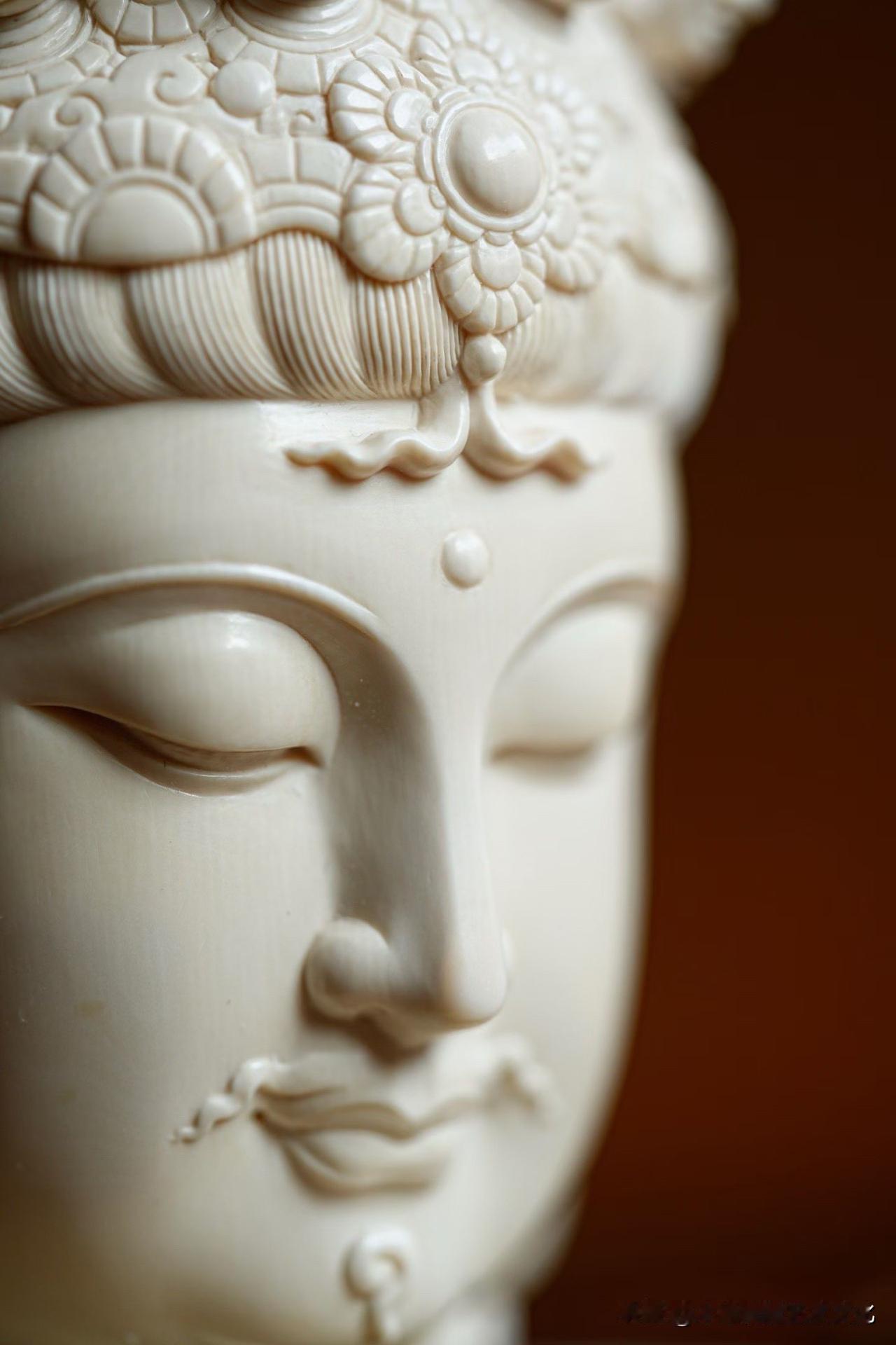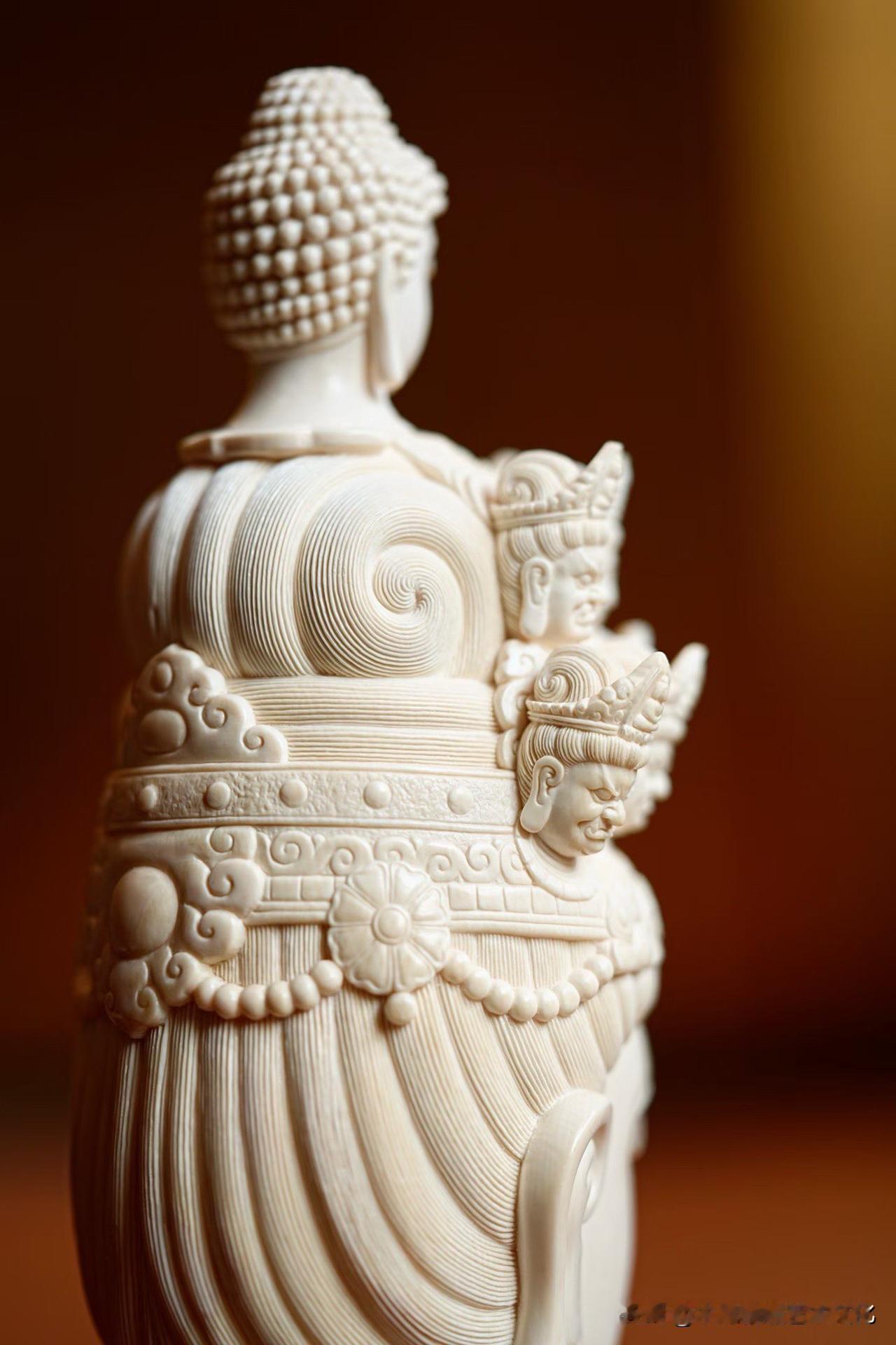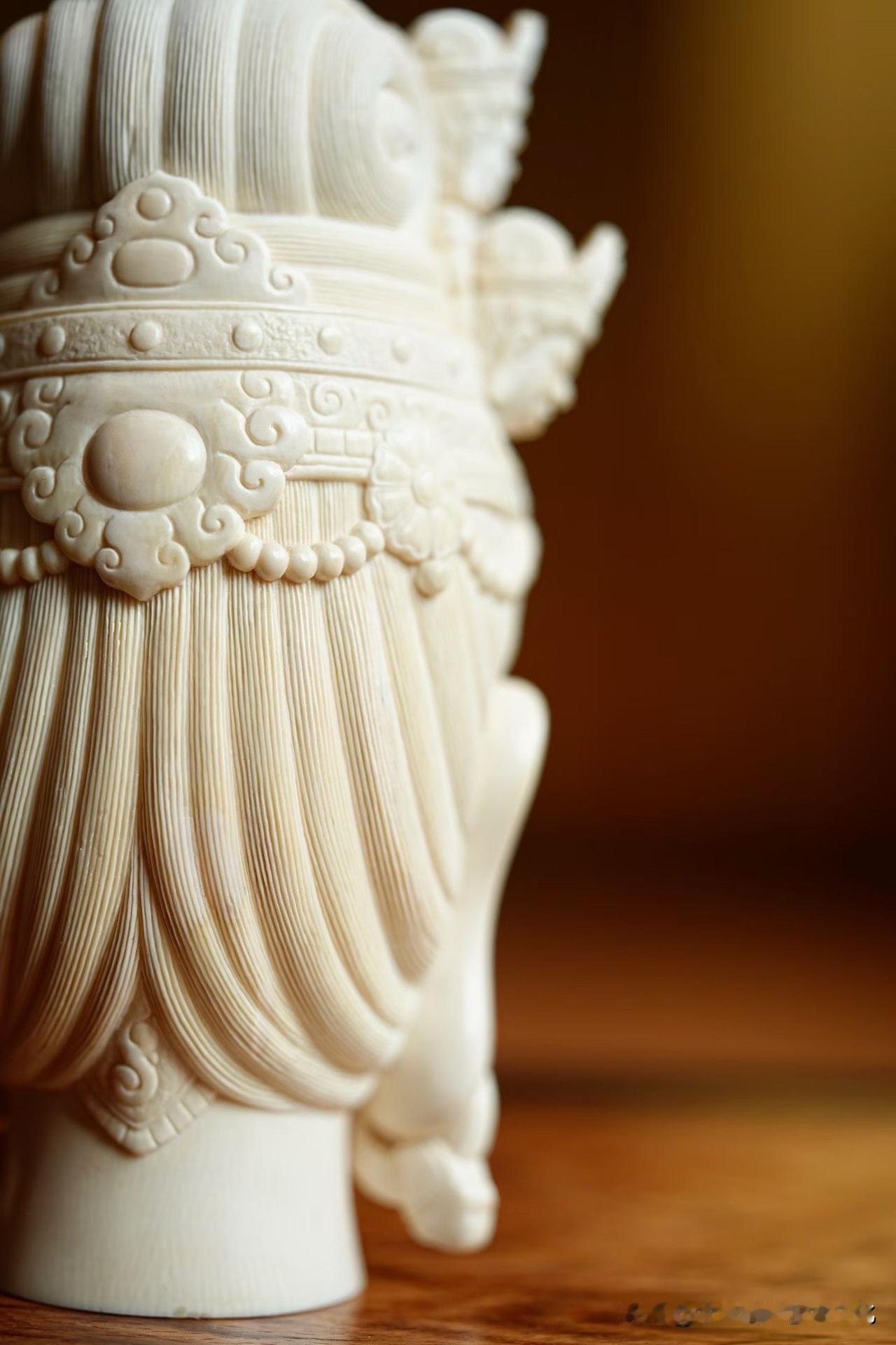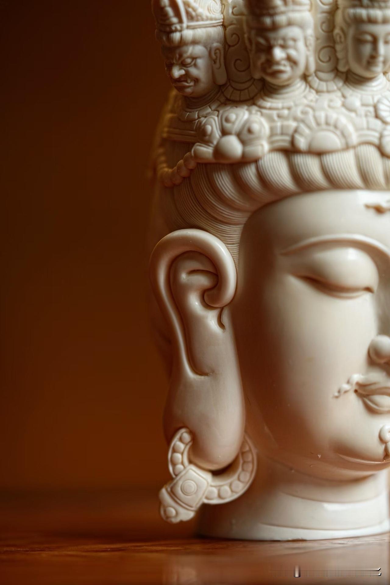 猛犸象牙|十一面观音 有些“多”,是为了回到“一”。 一面安静,十面众生。 慈、威、静、怒,层层叠起,不是复杂,而是把人心的种种,都收在一处。 材质温润如凝脂, 刀工却克制到极致—— 该细的地方入微,该收的地方不多一笔。 看久了,会发现它不只是“多面”, 而是在慢慢把心拉回一个点。 你觉得这样的造像, 是工艺更打动人,还是那份安定感更重要?