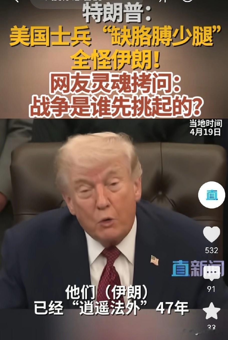 美国总统特朗普的言论, 真是让世界啼笑皆非。 特朗普称:美国士兵受伤缺胳膊或者少腿,全怪伊朗!怪苏莱曼尼!我们已经让他们(伊朗)无法无天“逍遥法外”40多年了! 美国和以色列不发动这场侵略战争,就不会有后续这些问题了! 那伊朗平民、儿童的牺牲是不是就要怪特朗普呢! 在特朗普看来,我这是在帮助世界,伊朗已经太目无法纪了! 特朗普的言论着实很让人费劲 说白了特朗普把自己当成了“世界警察”,在特朗普看来美国的行为就是警察执法合理合法!川普 美国川普 被特朗普言论震惊了 被特朗普言论震惊了