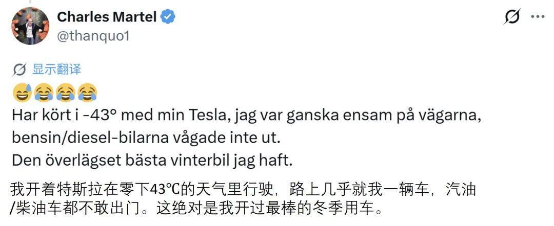 车主“thanquo1”分享了自己在瑞典零下43℃极寒环境下驾驶特斯拉的经历,表示特斯拉是他开过的最出色的冬季用车。