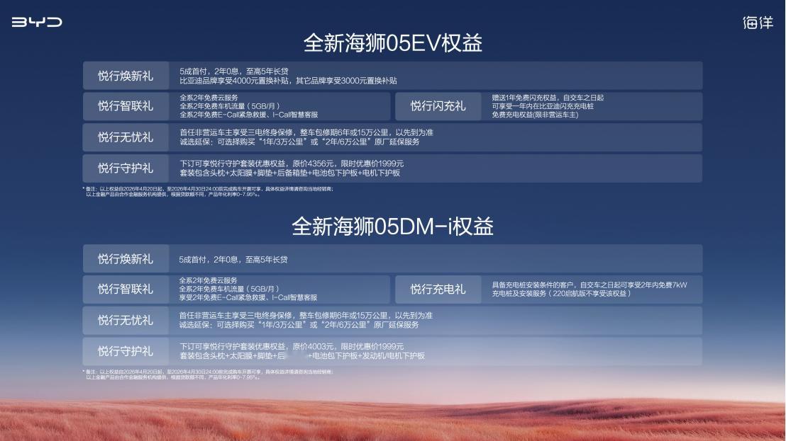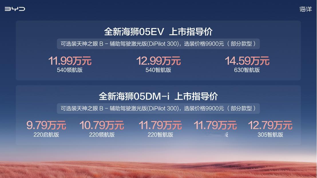 就在刚刚(4月20日19点),比亚迪都市智趣SUV全新海狮05系列正式发布,DM-i版9.79万-12.79万,EV版11.99万-14.59万。一句话总结就是,用9万级的价格,把长续航、快补能、高智驾全给你直接拉满,悦行越出彩。
