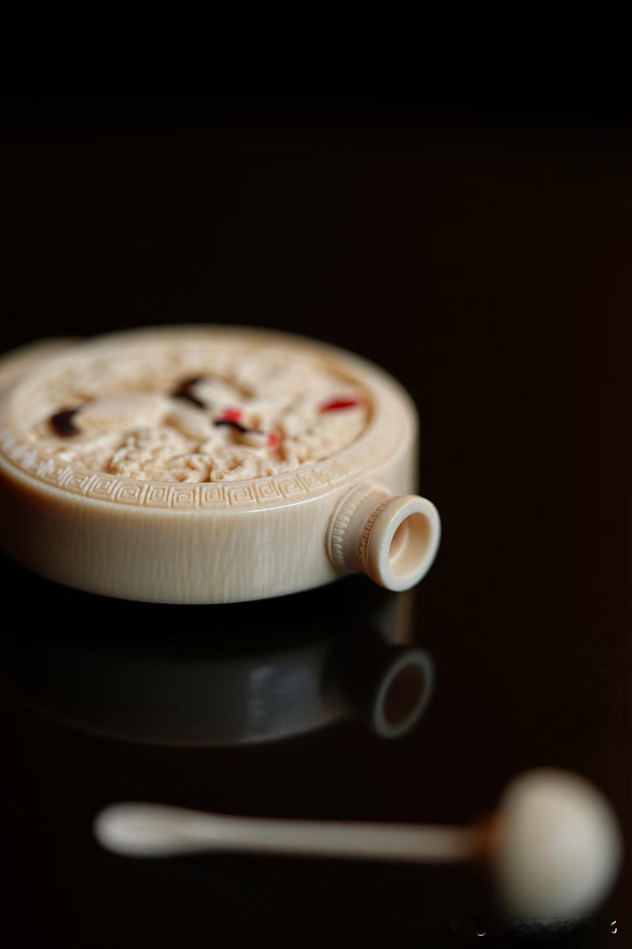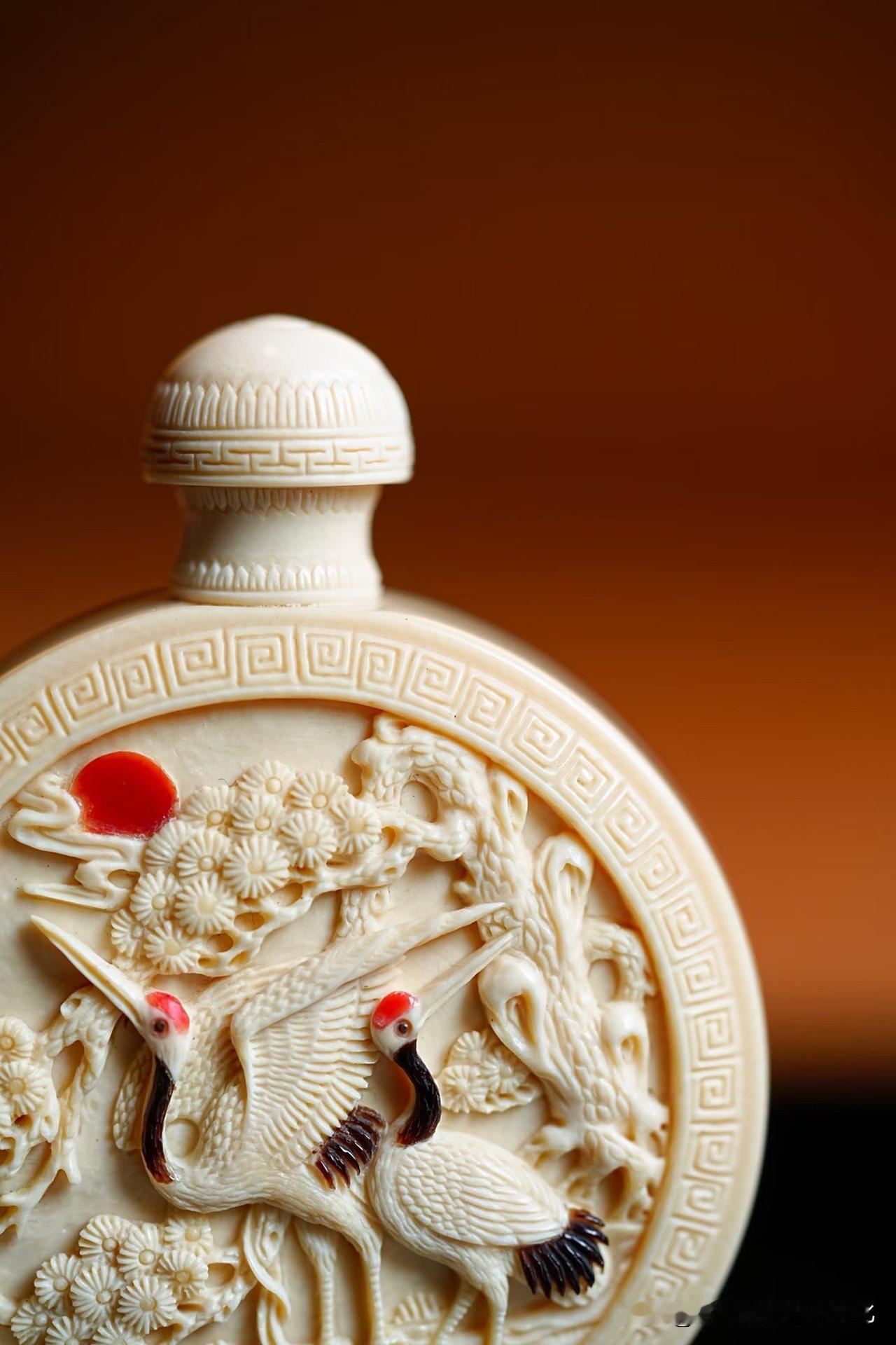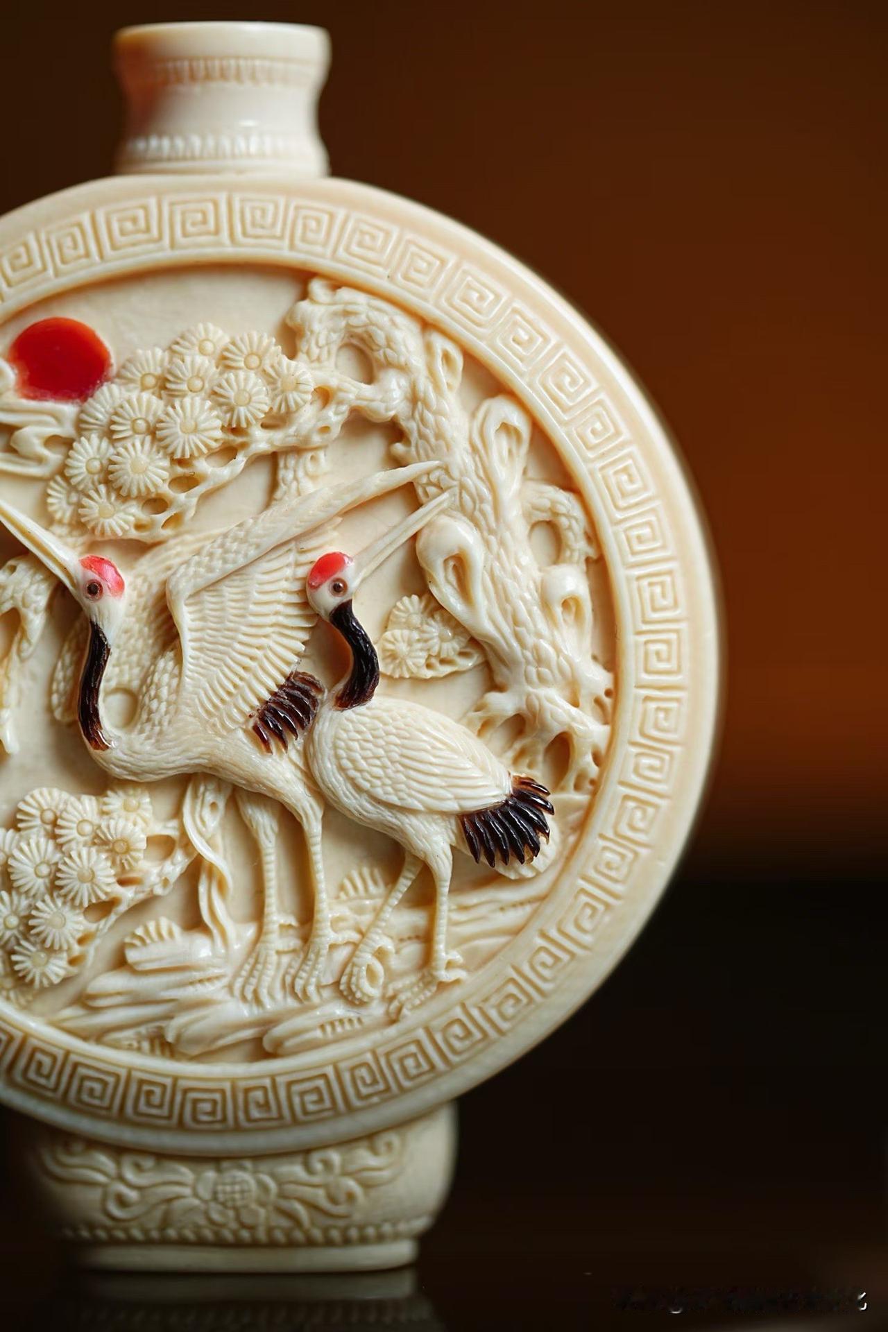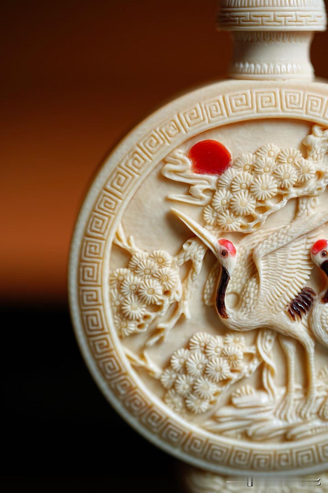 这一枚鼻烟壶,小,却不简单。 猛犸牙温润如玉,松枝舒展,仙鹤相对, 一轮红日点醒画面,静中见动,寿意自生。 方寸之间,却藏山林气象—— 不是在“雕物”,更像是在“养境”。 好的小件,从不只是精巧, 而是越看越有气息。 你会把它当器物, 还是当一幅可以随手把玩的画?非遗猛犸象牙 猛犸象牙香炉 猛犸牙穿戴印章 猛犸牙观音 猛犸牙雕工艺 猛犸牙挂饰 猛犸壶