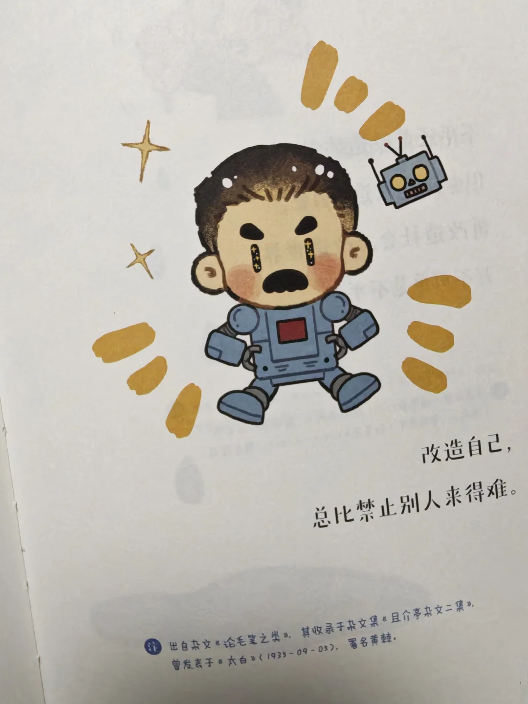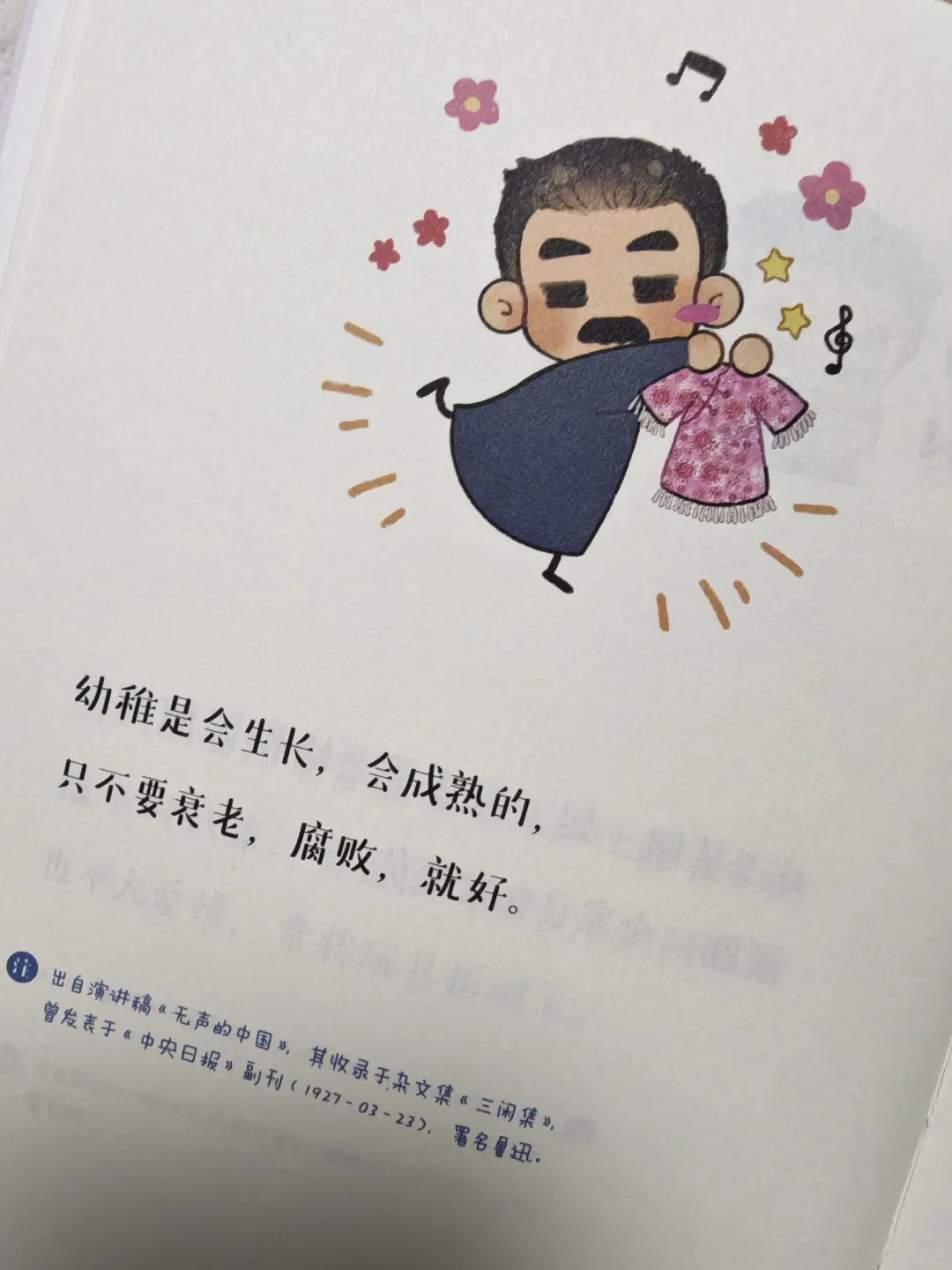 《我静立花下看蝴蝶小眠》就像是浓缩版的鲁迅精神图鉴,从鲁迅的杂文、书信还有诗词里,挑出了一句句铿锵有力的句子,再配上Q版可爱的插画,让鲁迅的面貌可亲可近,形象也更加鲜活有趣。