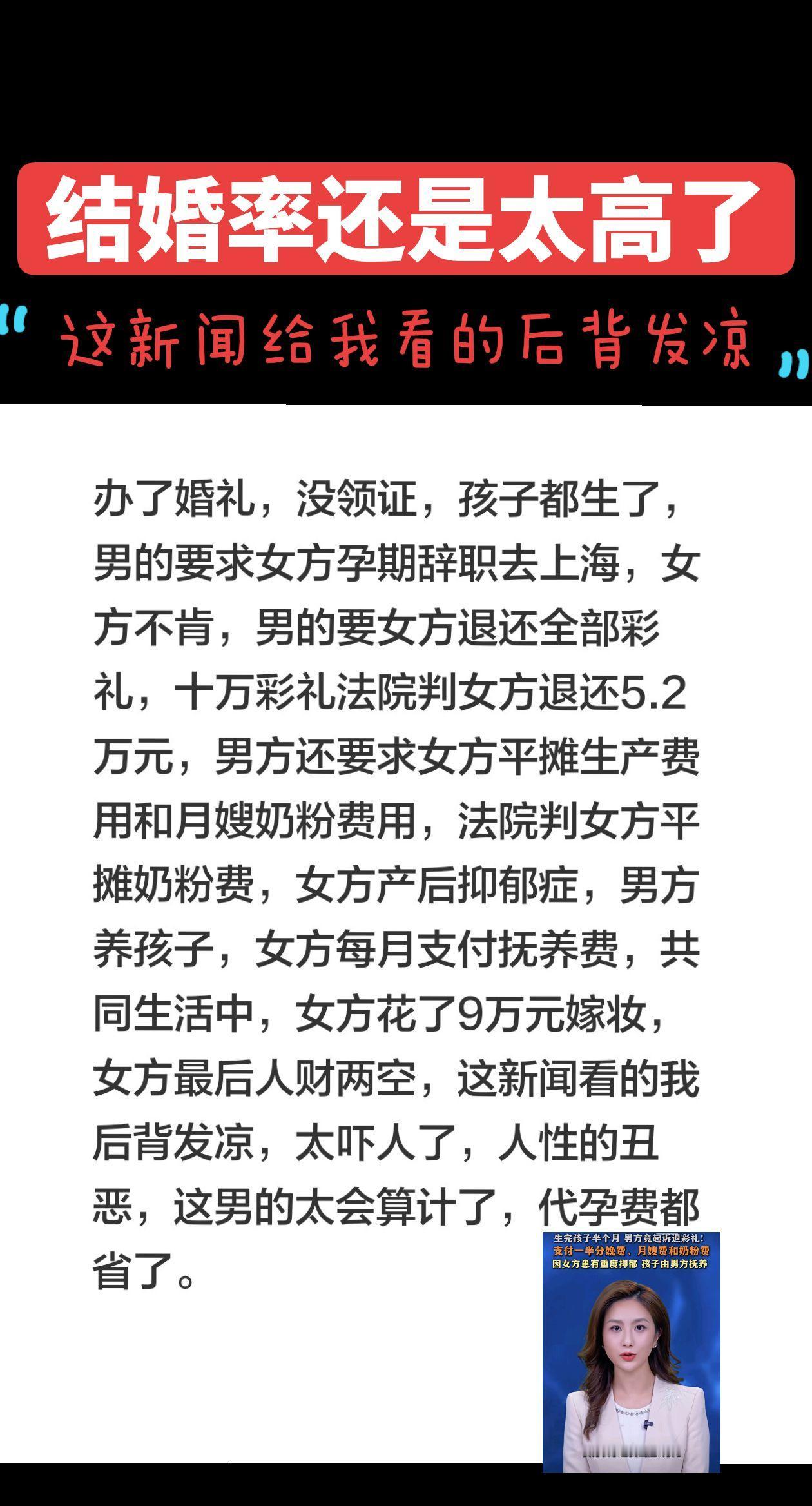 安徽一位宝妈,产后半个月,男方竟起诉退彩礼!生产费用月嫂男粉费,因女方患有重度抑郁,孩子由男方抚养,女方每月付抚养费,彩礼退一半,共同生活中女方花了自己9万嫁妆,最后人财两空