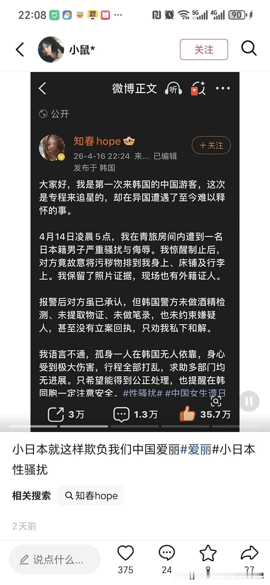 中国女孩在韩国青旅被日本人猥亵后续,返日男子已回韩当面道歉,商议会赔偿。 近日,一名女生在国内社交平台发声,说自己第一次去韩国,住在青旅的时候,一名日本男子脱裤裸露下体,站在女生头部的位置,女生醒来后,他还很嚣张,没有意识到错误,还把污秽物弄到女生身上、衣服上和行李箱上。 女生哪见过这样的事,第一想法就是报警留证据,谁知道报警后,韩国警方到达现场,竟然让双方和解,这种猥亵行为不应该抓人嘛? 更无语的是,最后这名日本男子回国了,女生无奈在网上发声,驻韩大使馆介入后,警方给出回应,并且联系男子尽快返韩接受处理。 以为男的跑回国内就不来韩国,谁知道还真来了,并且已经当面给女生道歉了,对于造成女生的损失,他表示会赔偿。 有网友表示,韩国真的是跪久了,对日本人仁慈,忘了历史。 也有网友说,青旅虽然便宜,但是出门在外还是住酒店,尤其是女孩子。 还有网友说,再不处理,以后没人敢去韩国旅游,韩国旅游业急剧下降。