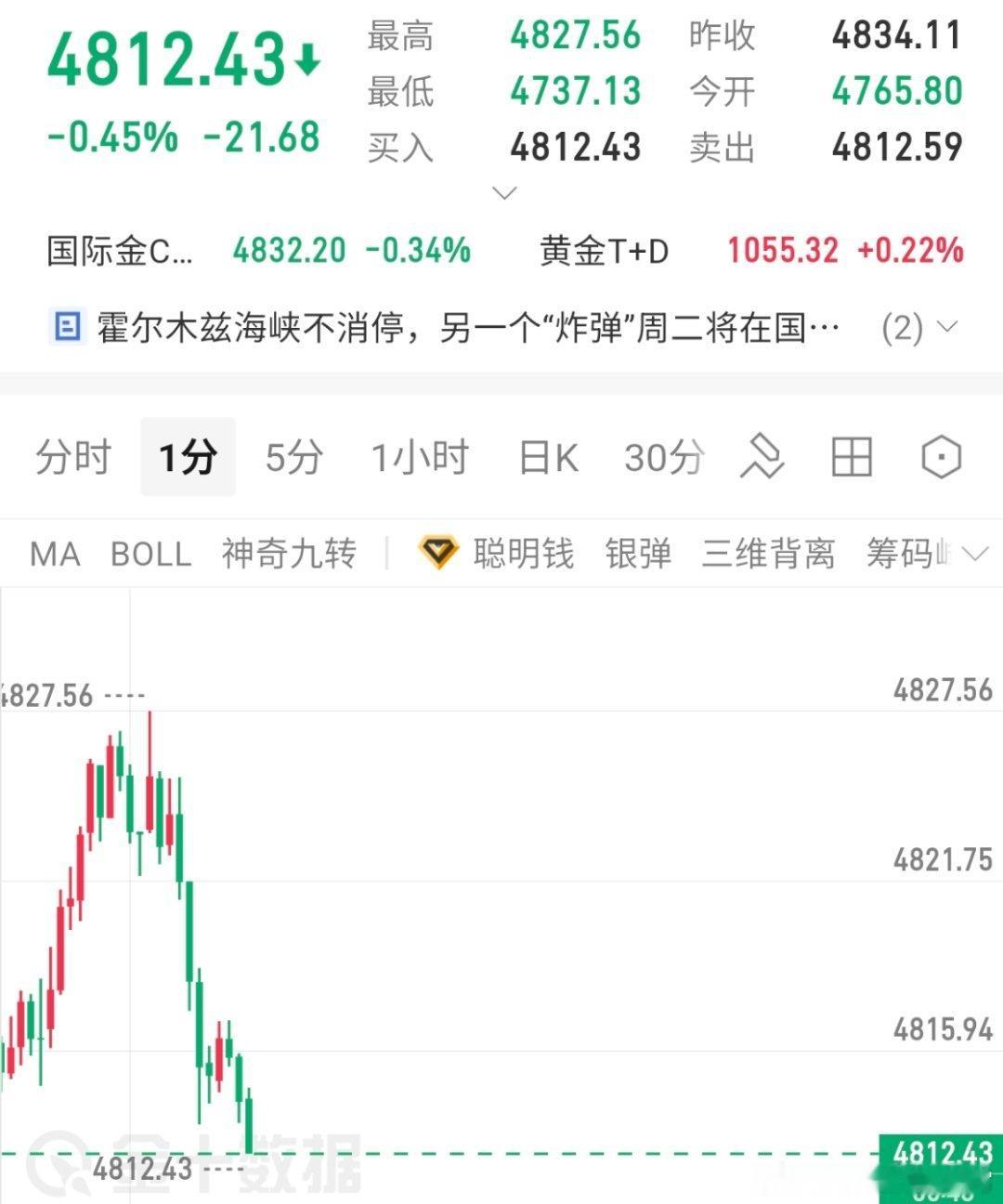 昨天黄金开盘在4833.8美元一线,黄金跳空低开,早上一波下跌最低触及到了473