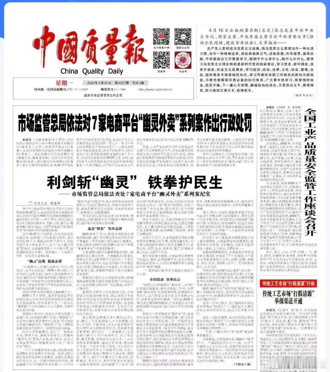 2026年4月17日,市场监管总局一纸罚单,35.97亿元。这是食品安全法实施以来的最高纪录。七家电商平台,无一幸免。但比数字更刺眼的,是罚单背后那场惊心动魄的执法历程。今天中国质量日报写了一篇《市场监管总局依法查处7家电商平台“幽灵外卖”系列案纪实》故事要从一个蛋糕说起。2025年7月,北京消费者刘先生在某平台下单了一款生日蛋糕。