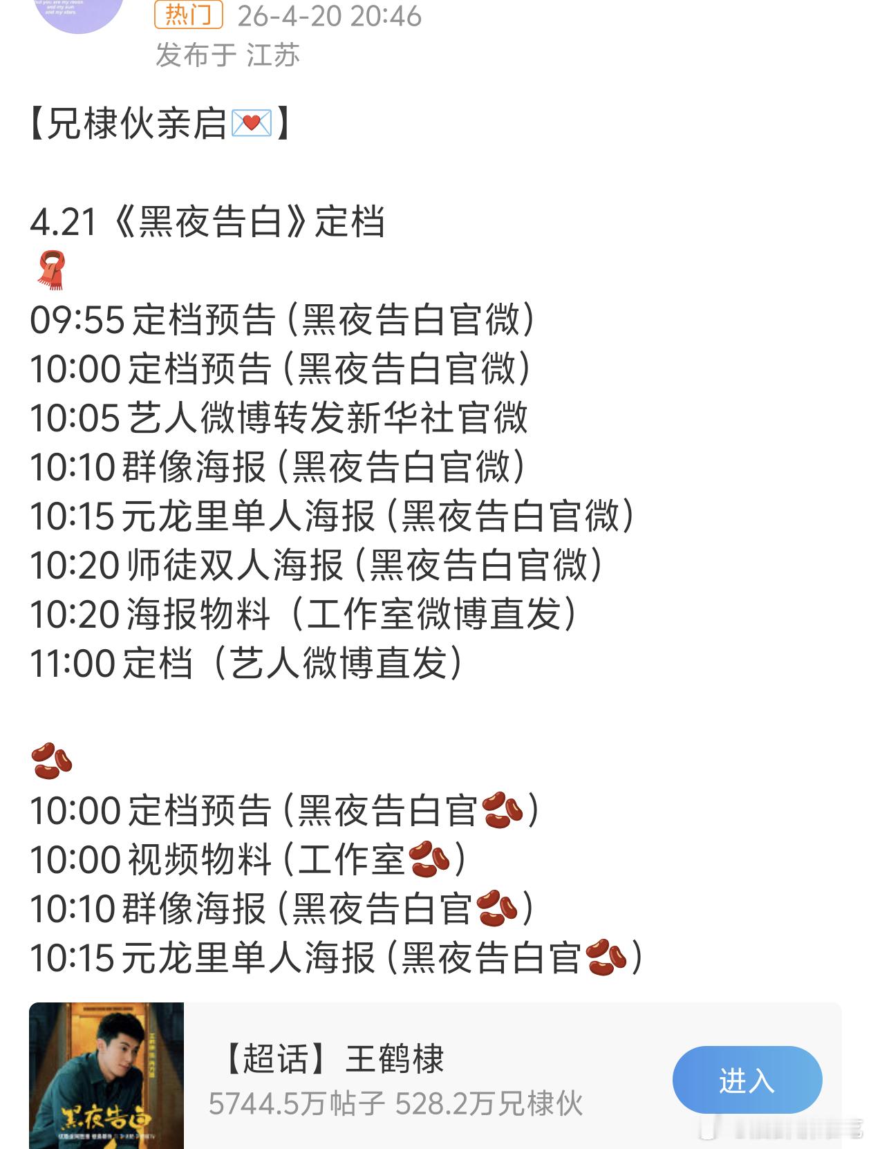 王鹤棣《黑夜告白》今天要定档了