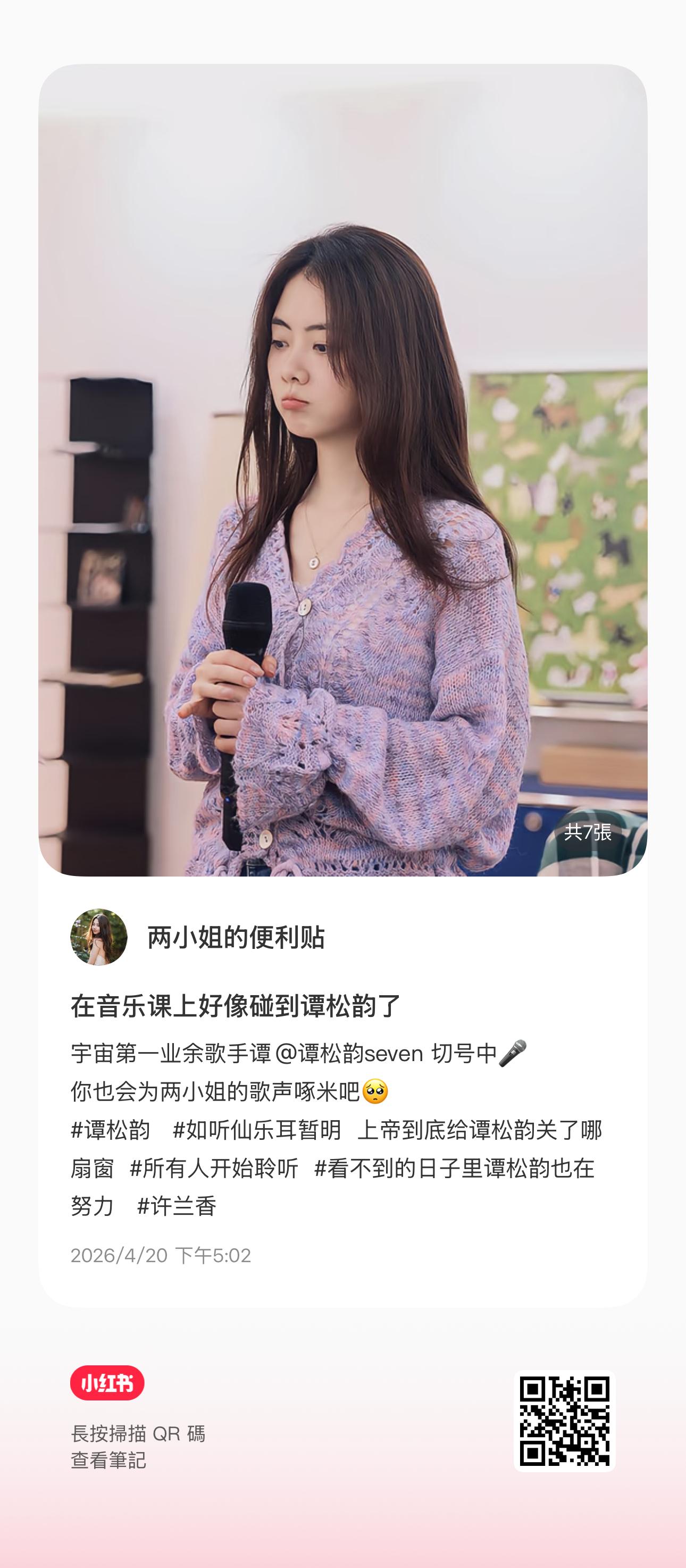2026.04.20 工作室📕在音乐课上好像碰到谭松韵了宇宙第一业余歌手谭切号中🎤你也会为两小姐的歌声啄米吧🥺如听仙乐耳暂明上帝到底给谭松韵关了哪扇窗所有人开始聆听看不到的日子里谭松韵也在努力