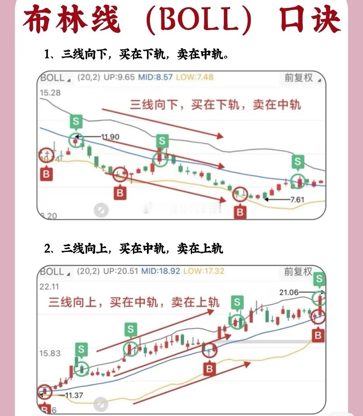 当布林线的上轨、中轨、下轨整体向上倾斜时,市场处于上涨趋势中。此时,股价回调至中轨附近往往会获得支撑重启升势,适合逢低买入(“买在中轨”);而当股价上涨至上轨附近时,会面临压力回落,适合逢高卖出(“卖在上轨”)。