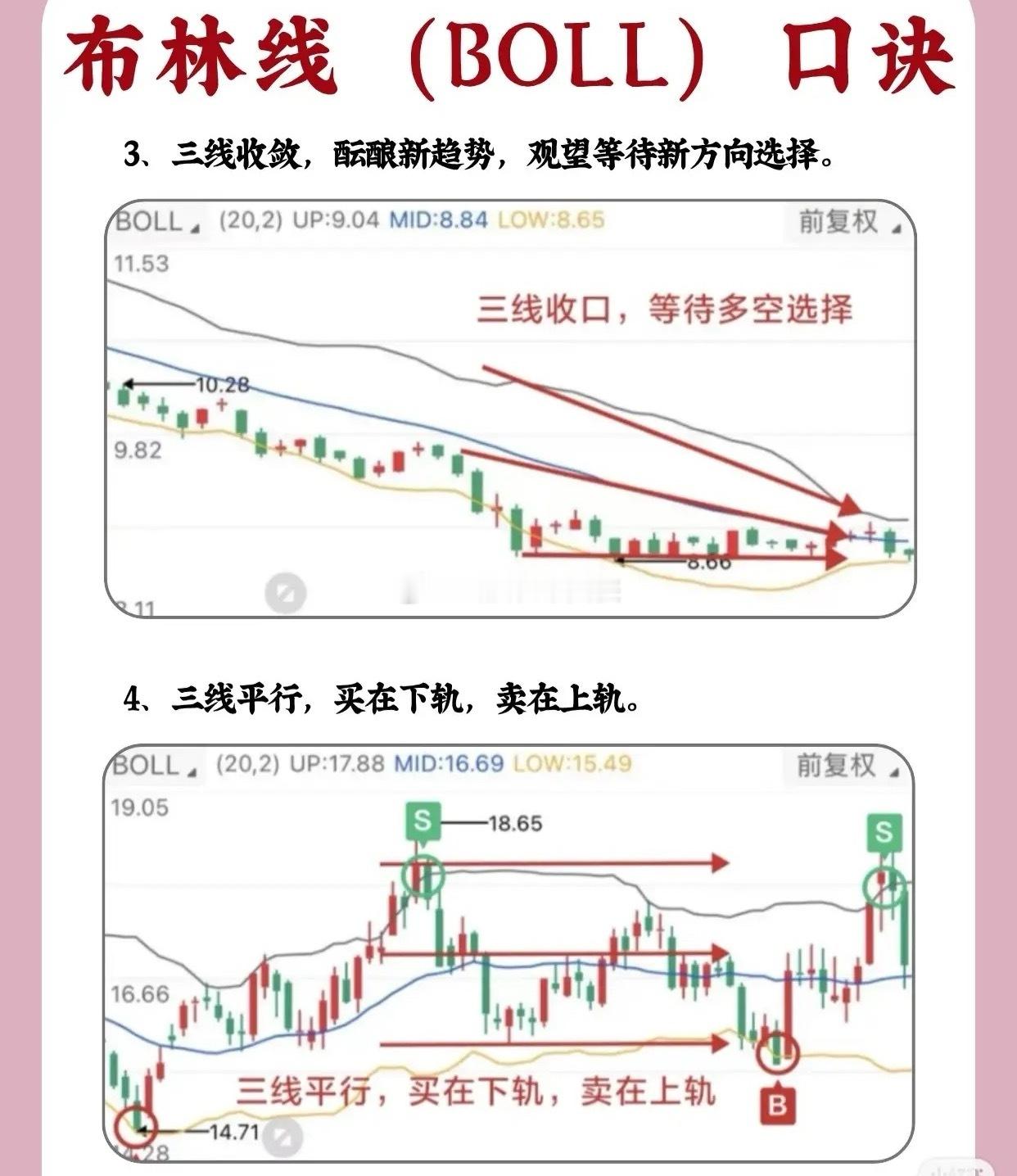 当布林线的上轨、中轨、下轨间距逐渐缩小(收口)时,说明市场波动率降低,多空力量暂时均衡,正在酝酿新的趋势。此时应观望为主,等待股价突破布林线上下轨,确认新的方向后再行动。