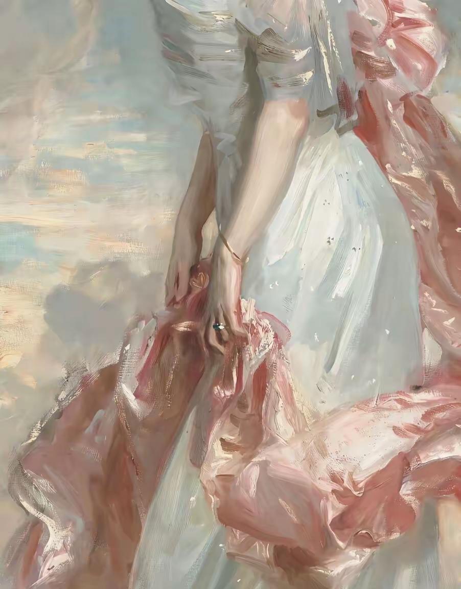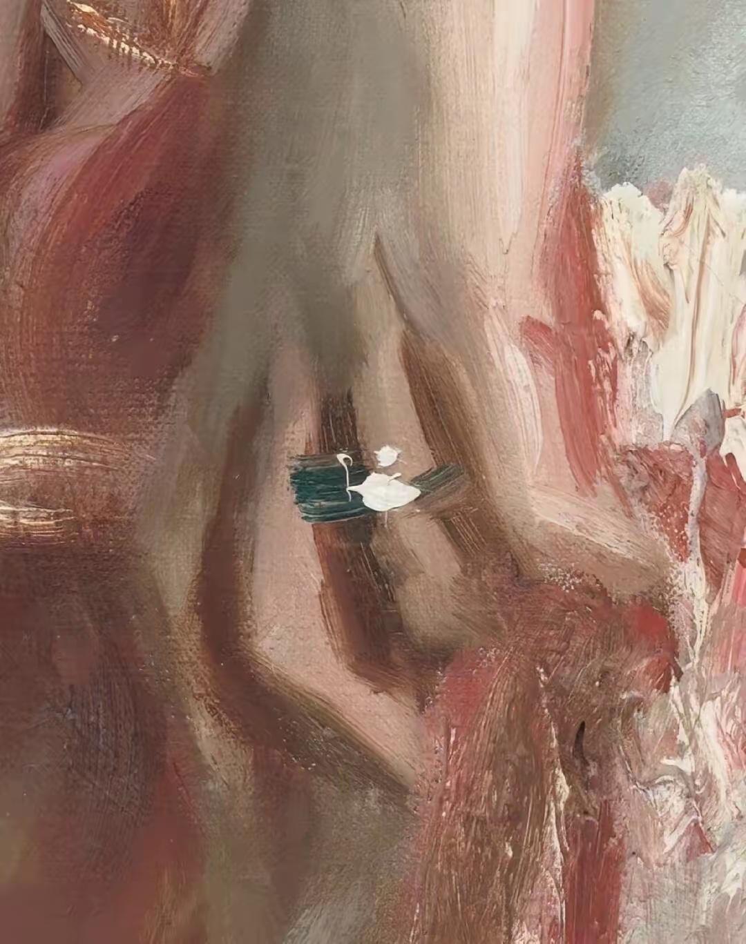 画家的天赋不在极致的追求! 这幅油画是西方早期的油画,仔细看,画家用极简的手法就刻画出女主人公手指上的一枚戒指,这才是真正的绘画大师思维方式。