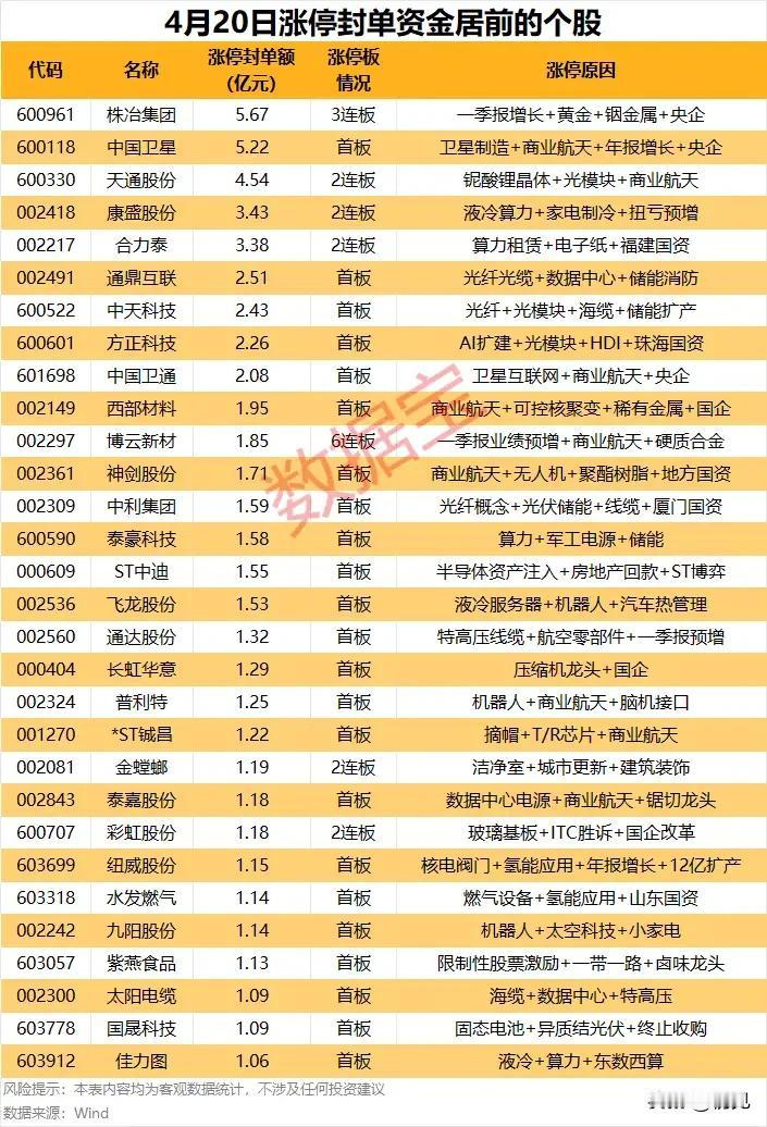 4月20日涨停封单资金靠前个股梳理:主线轮动活跃,6连板龙头领涨! 本次梳理的是4月20日涨停封单资金居前的个股,封单额从1.06亿元至5.67亿元不等,连板梯队清晰,博云新材以6连板领涨,株冶集团3连板,另有多只2连板个股。市场主线集中在商业航天、算力液冷两大方向,同时叠加国企改革、业绩预增、新能源等题材,央企/国企标的占比不低,资金聚焦度高,呈现多主线并行的轮动特征。 个股梳理分析 1. 株冶集团:封单5.67亿元,为3连板个股,涨停源于一季报增长,叠加黄金、铟金属题材与央企背景。 2. 中国卫星:封单5.22亿元,为首板个股,受益于卫星制造、商业航天题材,叠加年报增长与央企属性。 3. 天通股份:封单4.54亿元,为2连板个股,涨停因铌酸锂晶体、光模块题材,叠加商业航天概念。 4. 康盛股份:封单3.43亿元,为2连板个股,受益于液冷算力、家电制冷题材,叠加扭亏预增利好。 5. 合力泰:封单3.38亿元,为2连板个股,涨停源于算力租赁、电子纸题材,叠加福建国资背景。 6. 通鼎互联:封单2.51亿元,为首板个股,受益于光纤光缆、数据中心题材,叠加储能消防概念。 7. 中天科技:封单2.43亿元,为首板个股,涨停因光纤、光模块题材,叠加海缆业务与储能扩产计划。 8. 方正科技:封单2.26亿元,为首板个股,受益于AI扩建、光模块题材,叠加HDI业务与珠海国资背景。 9. 中国卫通:封单2.08亿元,为首板个股,涨停源于卫星互联网、商业航天题材,叠加央企属性。 10. 西部材料:封单1.95亿元,为首板个股,受益于商业航天、可控核聚变题材,叠加稀有金属与国企背景。 11. 博云新材:封单1.85亿元,为6连板个股,涨停因一季报业绩预增,叠加商业航天与硬质合金题材。 12. 神剑股份:封单1.71亿元,为首板个股,受益于商业航天、无人机题材,叠加聚酯树脂与地方国资背景。 13. 中利集团:封单1.59亿元,为首板个股,涨停源于光纤概念、光伏储能题材,叠加线缆业务与厦门国资背景。 14. 泰豪科技:封单1.58亿元,为首板个股,受益于算力、军工电源题材,叠加储能业务布局。 15. ST中迪:封单1.55亿元,为首板个股,涨停源于半导体资产注入预期,叠加房地产回款与ST博弈。 16. 飞龙股份:封单1.53亿元,为首板个股,受益于液冷服务器、机器人题材,叠加汽车热管理业务。 17. 通达股份:封单1.32亿元,为首板个股,涨停因特高压线缆、航空零部件题材,叠加一季报预增利好。 18. 长虹华意:封单1.29亿元,为首板个股,受益于压缩机龙头定位,叠加国企背景属性。 19. 普利特:封单1.25亿元,为首板个股,涨停源于机器人、商业航天题材,叠加脑机接口概念。 20. *ST铖昌:封单1.22亿元,为首板个股,受益于摘帽预期,叠加T/R芯片与商业航天题材。 21. 金螳螂:封单1.19亿元,为2连板个股,涨停源于洁净室、城市更新题材,叠加建筑装饰业务优势。 22. 泰嘉股份:封单1.18亿元,为首板个股,受益于数据中心电源、商业航天题材,叠加锯切龙头定位。 23. 彩虹股份:封单1.18亿元,为2连板个股,涨停因玻璃基板、ITC胜诉利好,叠加国企改革概念。 24. 纽威股份:封单1.15亿元,为首板个股,受益于核电阀门、氢能应用题材,叠加年报增长与扩产计划。 25. 水发燃气:封单1.14亿元,为首板个股,涨停源于燃气设备、氢能应用题材,叠加山东国资背景。 26. 九阳股份:封单1.14亿元,为首板个股,受益于机器人、太空科技题材,叠加小家电业务优势。 27. 紫燕食品:封单1.13亿元,为首板个股,涨停因限制性股票激励计划,叠加一带一路与卤味龙头定位。 28. 太阳电缆:封单1.09亿元,为首板个股,受益于海缆、数据中心题材,叠加特高压业务布局。 29. 国晟科技:封单1.09亿元,为首板个股,涨停源于固态电池、异质结光伏题材,叠加终止收购影响。 30. 佳力图:封单1.06亿元,为首板个股,受益于液冷、算力题材,叠加东数西算业务布局。 总结 整体来看,4月20日涨停封单靠前的个股,以商业航天、算力液冷为两大核心主线,连板梯队清晰,资金聚焦度高。同时,国企/央企标的、业绩预增个股也获得资金青睐,题材轮动中兼具确定性与弹性,市场热点分布均衡,不同赛道均有资金活跃。 风险提示:本文内容均为客观数据统计,不构成任何投资建议。
