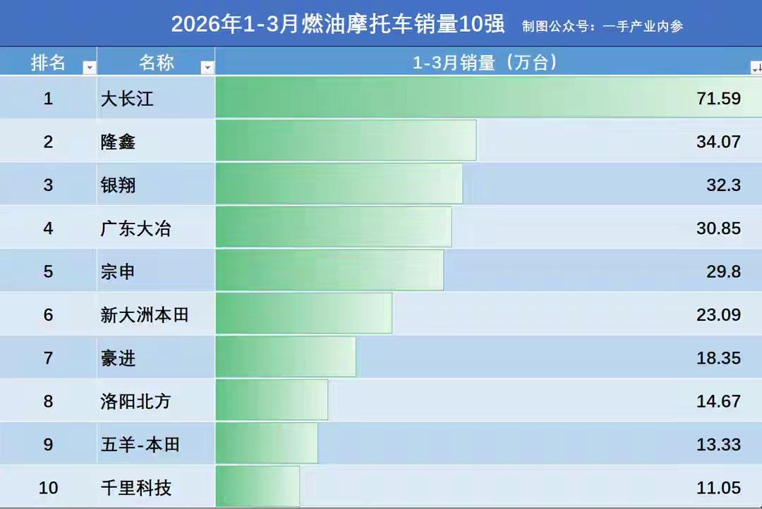 【盘点2026第一季度摩托销量:豪爵断层第一,银翔翻倍】 2026年一季度燃油摩托销量460.35万辆,大长江(豪爵)以71.59万辆断层领先,等于第二、三名总和。 最大黑马:重庆银翔销量翻倍至32.3万辆,直逼亚军隆鑫,主要得益于海外ODM订单爆发。 市场两极:国内销量115万(微跌),海外占比高达75%。国内通勤市场被电摩挤压,燃油车增长全靠中大排量玩乐车型支撑。 专家视角:流量品牌(如张雪)负责“拔高”,豪爵、银翔等出口巨头才是中国摩托工业的“基本盘”。出海,才是国产摩托的未来主战场。摩托产业 摩托天下第一好 安岳豪爵摩托 喀什豪爵摩托 江口豪爵摩托车 喀什豪爵摩托车 行豪爵摩托车 梧州豪爵摩托车 摩托车D证和E证哪个好考点 丽水豪爵摩托车 豪爵摩托车广告 保康豪爵摩托 什邡豪爵摩托 安岳豪爵摩托车 河南豪爵摩托车 150踏板销量