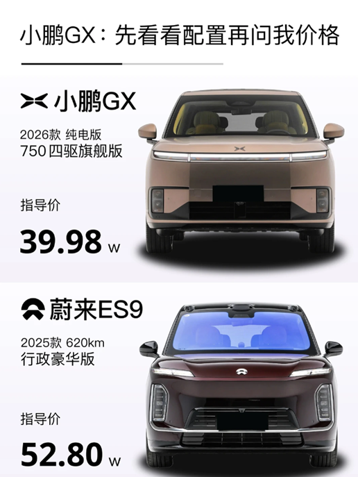 上周小鹏GX预售39.98万,而蔚来ES9预售则是52.8万起。 两台都是品牌旗舰级大六座SUV,价格差了13万左右——不是谁便宜谁就更有优势,而是从核心定位上,就在回应不同用户的需求命题。 GX的答案:以智能化打造旗舰竞争力。基于小鹏最新的整车架构打造,前装智能辅助驾驶硬件预留了Robotaxi级的升级潜力,搭配线控转向、800V平台配5C超充(10分钟补能近500km)。纯电续航750km,增程版综合续航1400km以上。 更值得关注的是——这是小鹏首款增程车型。一家以纯电起家的品牌推出增程版,本身就是一种务实信号:单一纯电路线难以覆盖所有用车场景,给用户多一种选择,比单纯坚持路线更有意义。 ES9的答案:纯电实力+完善服务生态。车长5365mm、轴距3250mm,属于国内体量较大的纯电SUV之一。搭载707匹马力、900V架构,全系标配102kWh电池,三激光雷达配置一步到位。但ES9真正的核心优势在车外:换电三分钟补能、NIO House服务体系及用户社区——用户买到的不只是一台车,更是一整套便捷的用车生活方式。周末高速换电站无需长时间停留,抵达目的地后也有专属空间歇脚充电。 如果对比租电方案,ES9(42万起)和GX(39.98万)的价格差距就缩小到2万左右了。