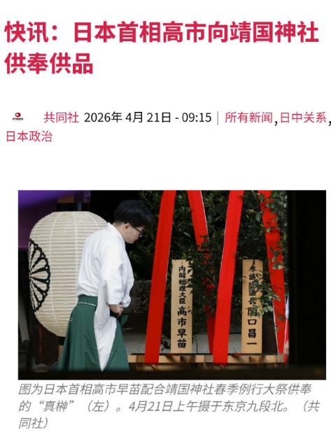共同社报道,4月21号,高市早苗向鬼社供奉祭品