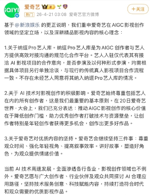 爱奇艺也回应并再次强调:艺人库里提及的艺人之前都是有合作意向且同意入驻的,绝无未经同意擅自纳入的情况发生。