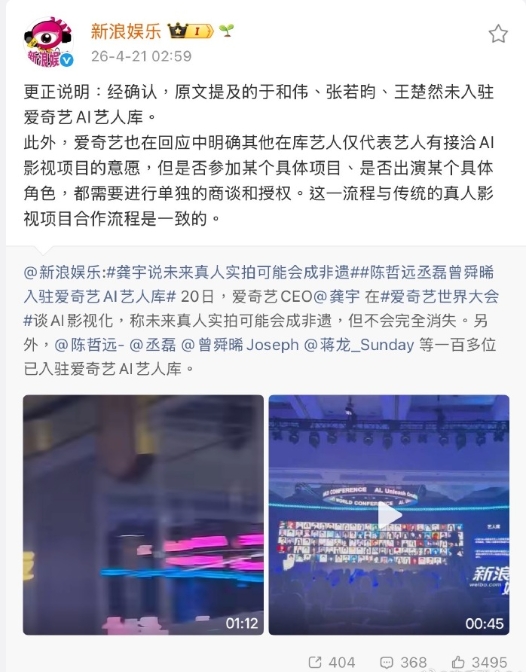 新浪娱乐凌晨发更正:张若昀、于和伟和王楚然不在爱奇艺AI艺人库里。