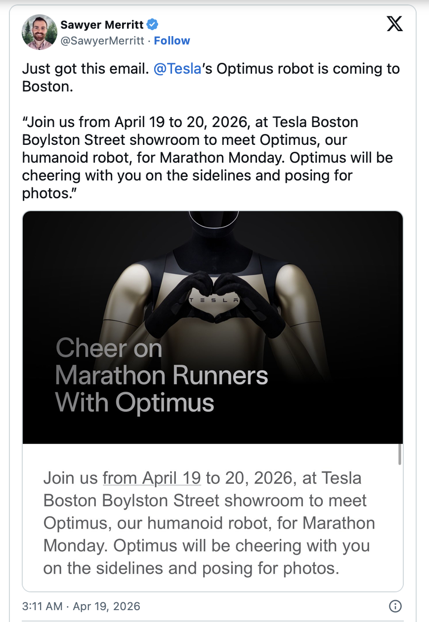 特斯拉将派出人形机器人亮相波士顿马拉松