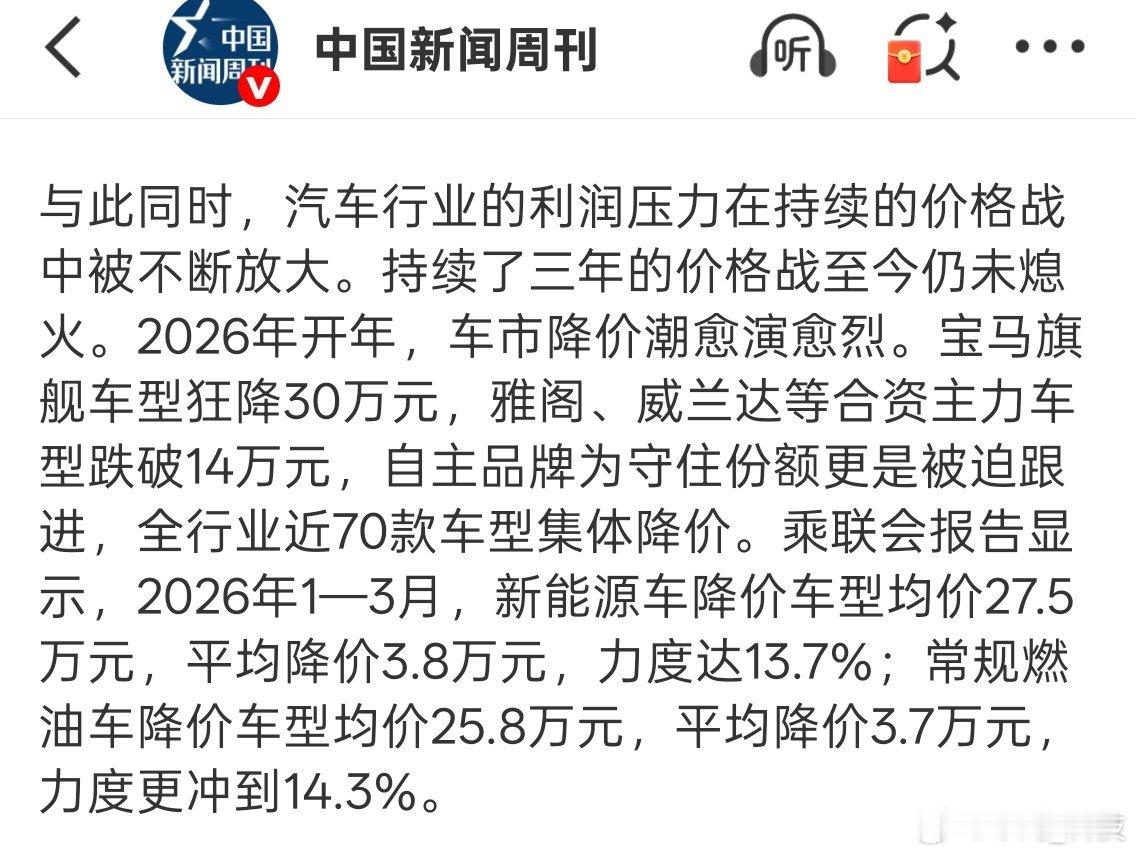 近70款车集体降价2026年1—3月,新能源车降价车型均价27.5万元,平均降价3.8万元,常规燃油车降价车型均价25.8万元,平均降价3.7万元。