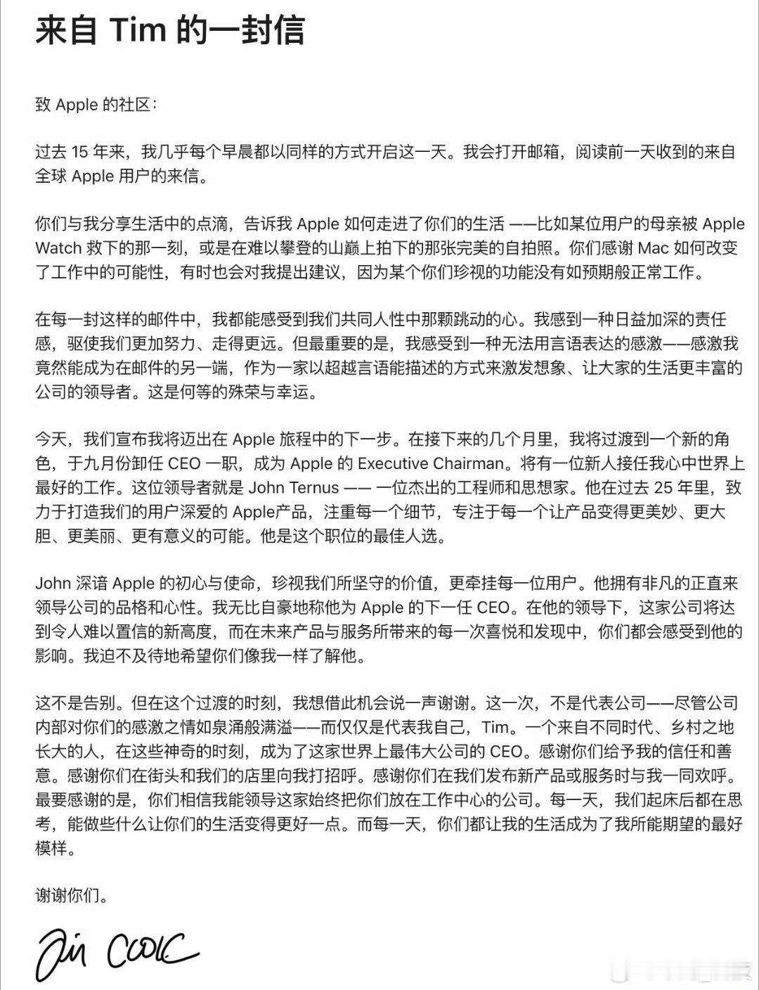 库克 9月1号卸任不再担任苹果CEO,改任执行董事长,约翰·特纳斯(John Ternus)接任CEO。库克不再担任苹果CEO