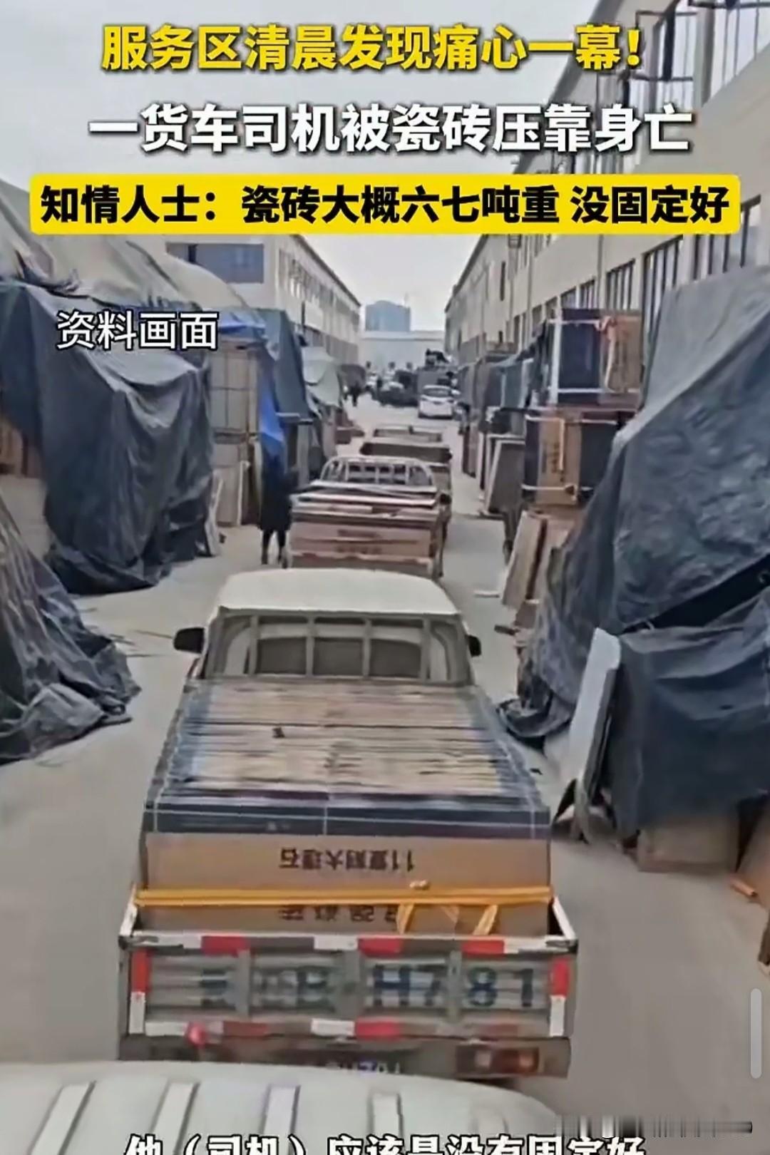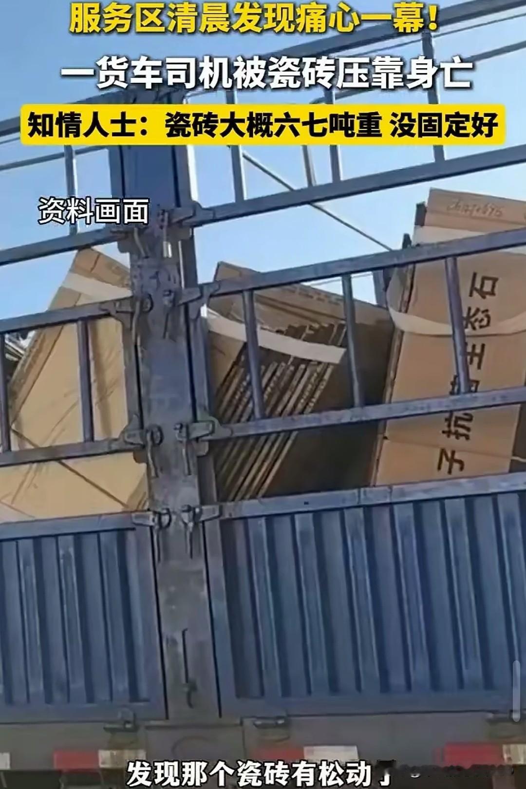 痛心!一货车司机清晨被瓷砖压靠身亡 安全事故不容小视,4月20日(发布时间),云南大理一名货车司机在服务区不幸被1吨多重的瓷砖压到胸部当场不幸死亡。 从视频中可以看到让人揪心的一幕:一名中年男子的胸部被瓷砖挤压不能动弹,被这么多的瓷砖挤压,男子的骨头可能都压碎了,导致了他来不及呼救就瞬间失去了生命。 现场目击者悲痛的讲述:事故发生在早上6~7点左右,大家发现一名货车司机被一挌瓷砖压着,一动不动的,自己上前查看,摸了司机师傅的手,他的手都没有温度已经冰凉了!压着他的瓷砖大概有一两吨重!事故的原因可能是,司机装货时没有固定好,等他开了一段路程后发现瓷砖松动了,他上去解开绳子时没有注意瓷砖压到了他,实在是太惨了!希望逝者安息!