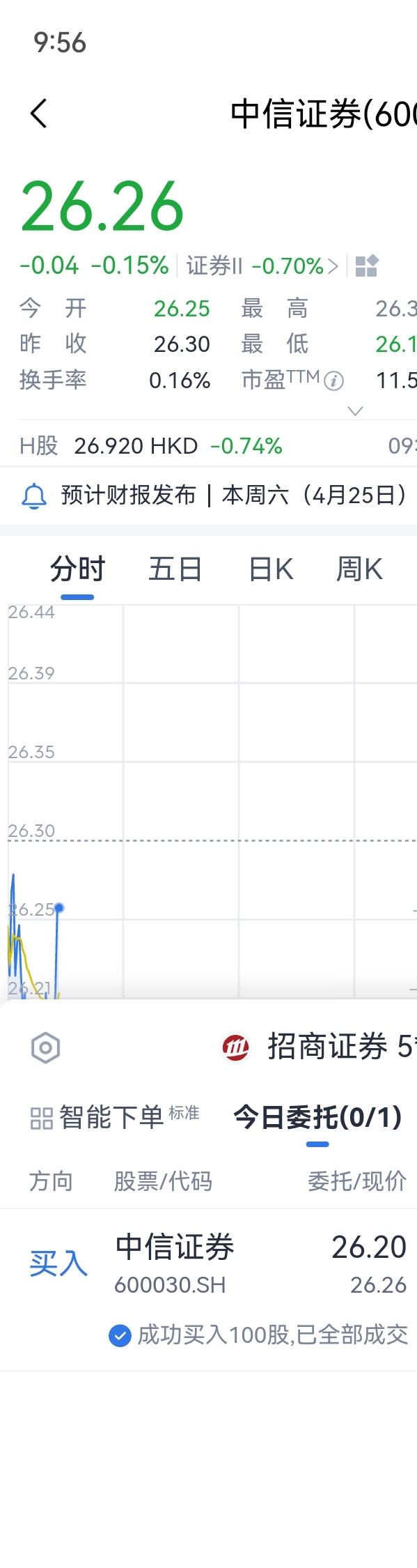 中信,26.2元建仓!总仓位3%!其他继续空仓! 原因如下: 1、底部,已确定,周线级别Macd金叉 2、多头排列,确认!短期趋势确认! 3、证券龙头中军,掉不下去 4、4月量价齐升,接近涨停!量能确认! 为什么仅建仓! 日线没有Macd金叉,还要磨底,25.5-56.7之间 计划:5月前完成基础建仓,约10%仓位,同时通过反复做T,降低成本至25.5附近!5月第二周,再次确认,仓位调整为30%(满了) 中信,是5月核心之一! 以上,纯个人分享,喜欢就支持一下!不喜欢,请拉黑,不要喷!