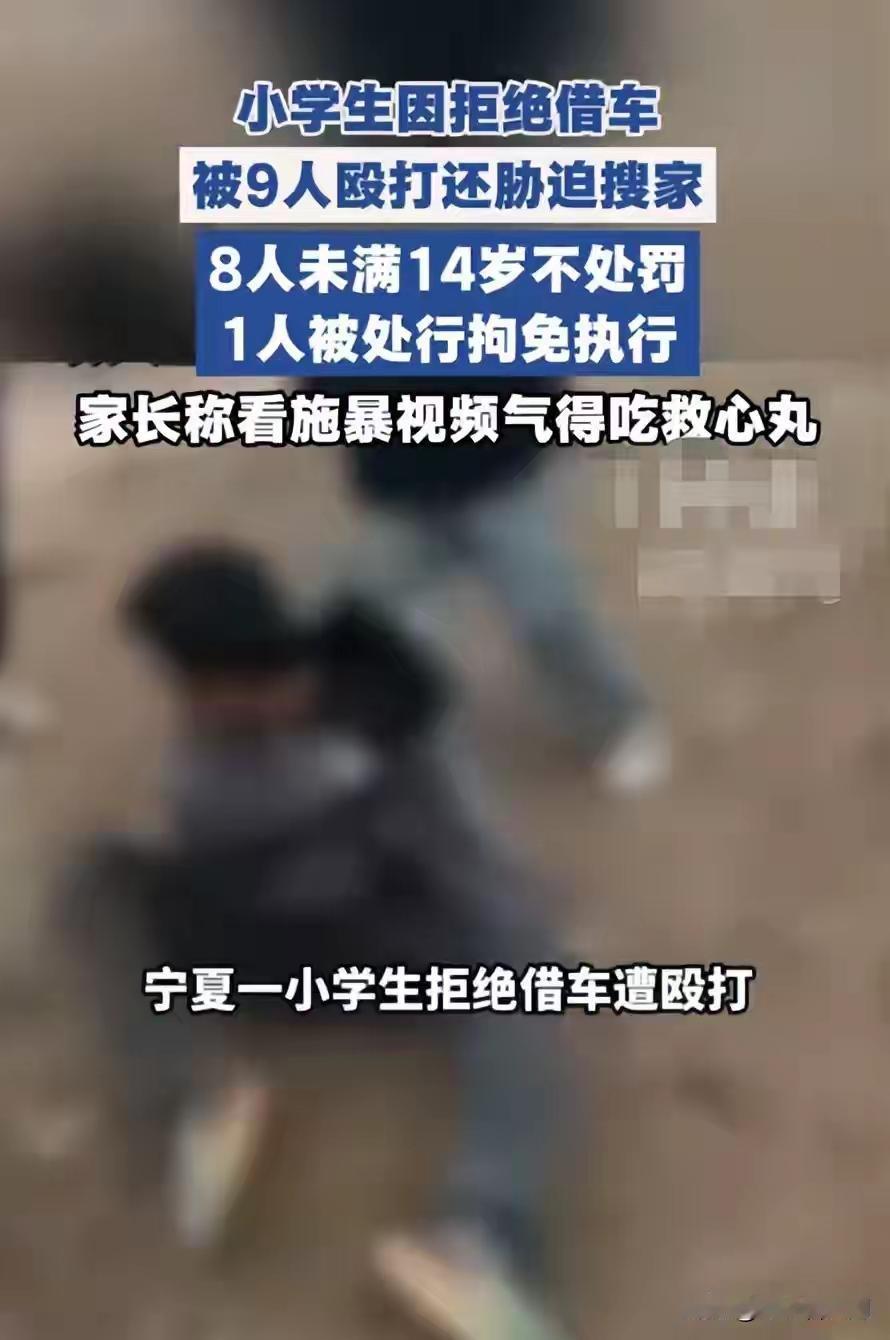 无法无天!一名小学生被9人围殴! 3月21日中午,银川某小学 小泽(化名)独自骑电动三轮车在兴泾镇玩耍,被9名中小学生拦截借车。 小泽不同意,就被9人围殴。之后,还不算完,又将 小泽胁迫到家中,在小泽家翻箱倒柜,造成财物丢失。 之后,小泽妈妈选择报警。 这件事的处理结果,更令人意难平: 9个围殴者中,除一个未满16岁年满1被行拘免执行,其他八人因为不满十四岁,无法追究责任! 这孩子,白打了!9个打人者,入室抢劫者,没事了! 这不是一起简单的未成年人霸凌闹剧,而是9人团伙入室抢劫,这是犯罪呀! 8个小恶魔,被无罪释放。年龄小,成了他们不被追责的理由! 无法想象,这样的小恶魔,如果有一天长大了,会怎样祸祸社会? 法律制裁不了他们,就把他们的恶行记录在档案上,让他们背一辈子污点! 春日生活打卡季