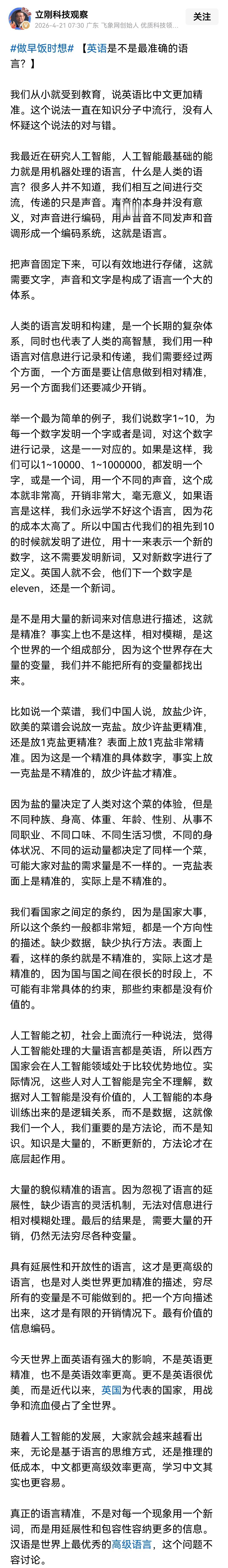 项立刚说英语不是准确的语言是对的,但我们还是要学英语,未来学英语的目的已经不是向西方学习,而且要向西方输出,让每一个有知识的人都能用英语对外输出自己的逻辑,我们的产品已经卖到世界各地,但在意识形态领域,在宣传领域,我们还落后太多,西方用几百年编织了一个巨大的认知牢笼,想冲破这个牢笼,不是几个学者就能做到的,需要靠上亿人的输出和宣传,英语就是最好的宣传工具。 所以不要抵触英语,英语只是一门语言,学习它只要肯下功夫都能学好。