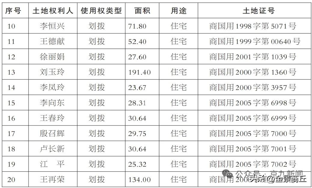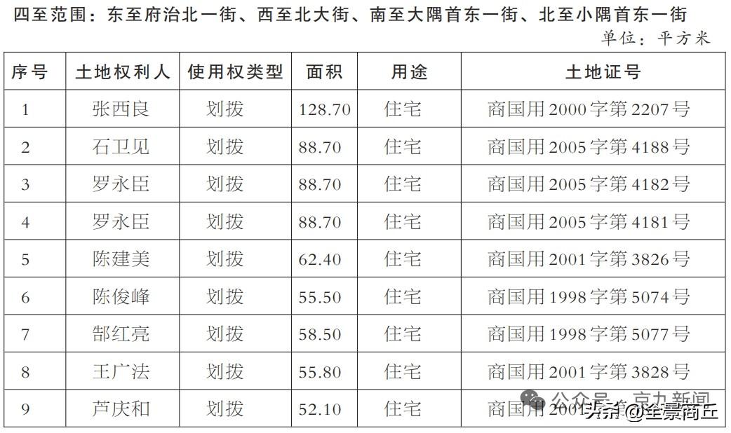 【商丘古城20宗国有建设用地拟被收回】为实施古城保护规划,合理利用古城内土地,根据《中华人民共和国土地管理法》及相关法律、法规之规定,我局拟报请市政府批准收回商丘古城内东至府治北一街、西至北大街、南至大隅首东一街、北至小隅首东一街范围内的国有建设用地使用权。经我局初步地籍调查,共有张西良等20宗国有建设用地使用权(详见附件)。对初步地籍调查结果有异议的(如错调、漏调等),有关土地使用权人请于本公告发布之日起10日内持身份和权属证明向我局提出更改、补充登记。相关权益单位或个人对拟收回上述国有建设用地使用权享有听证的权利,如对收回有异议或要求听证的,请自本公告发布之日起10日内,持合法产权证明、有效身份证件等有关材料提出书面听证申请(听证时间另行告知)。逾期未提出的,视为放弃权利,我局将依据调查结果向商丘市人民政府报请收回国有建设用地使用权。 联 系 人:夏继亭 联系电话:15738111821 联系地址:商丘市自然资源和规划局睢阳自然资源服务保障中心古城办公区(古城内当铺北一街路东) 特此公告。2026年4月20日 附件:府衙片区土地使用权人清单(via京九新闻)