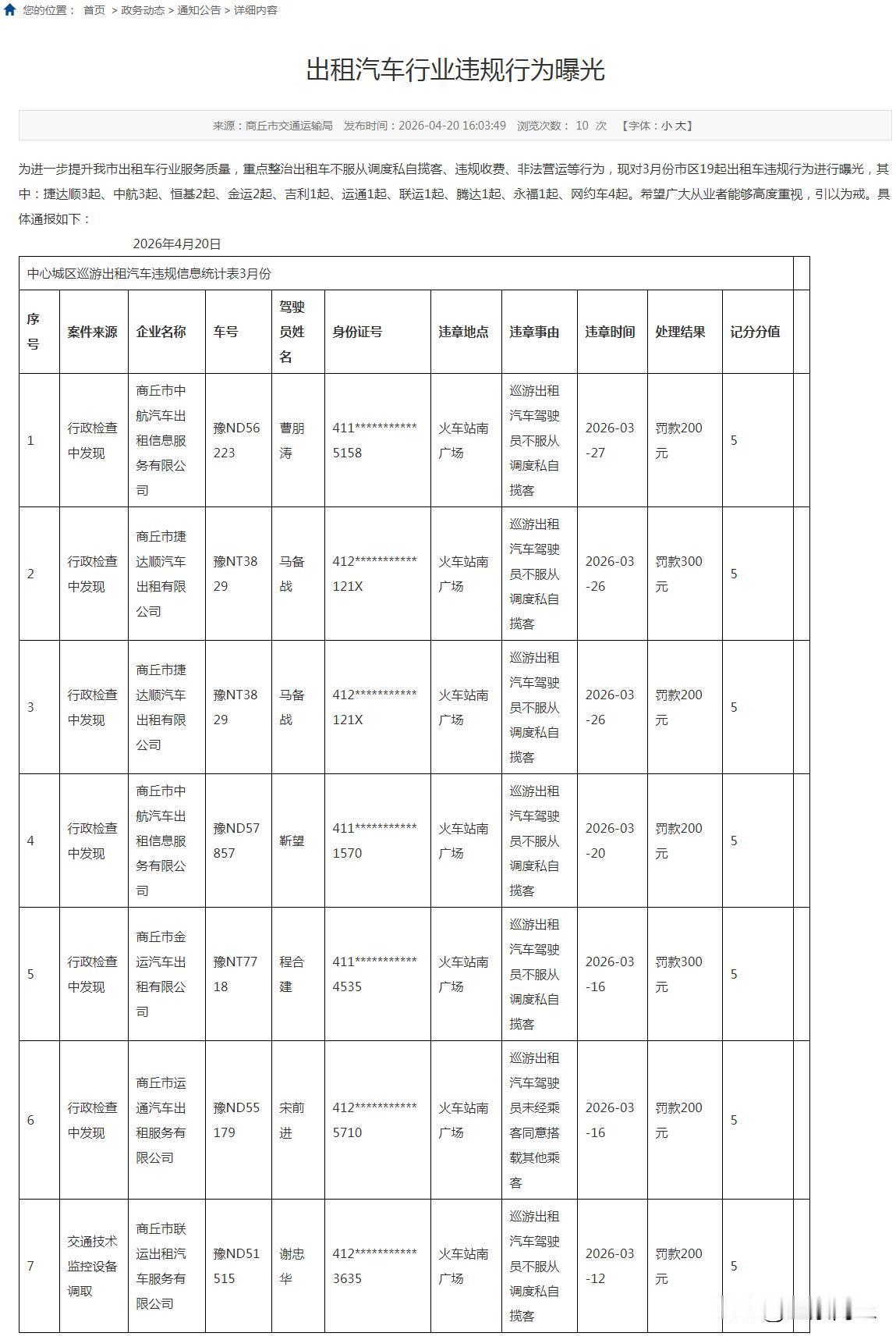 【商丘曝光出租汽车行业违规行为】为进一步提升我市出租车行业服务质量,重点整治出租车不服从调度私自揽客、违规收费、非法营运等行为,现对3月份市区19起出租车违规行为进行曝光,其中:捷达顺3起、中航3起、恒基2起、金运2起、吉利1起、运通1起、联运1起、腾达1起、永福1起、网约车4起。希望广大从业者能够高度重视,引以为戒。具体通报如下。↓↓↓ 2026年4月20日(via商丘市交通运输局)