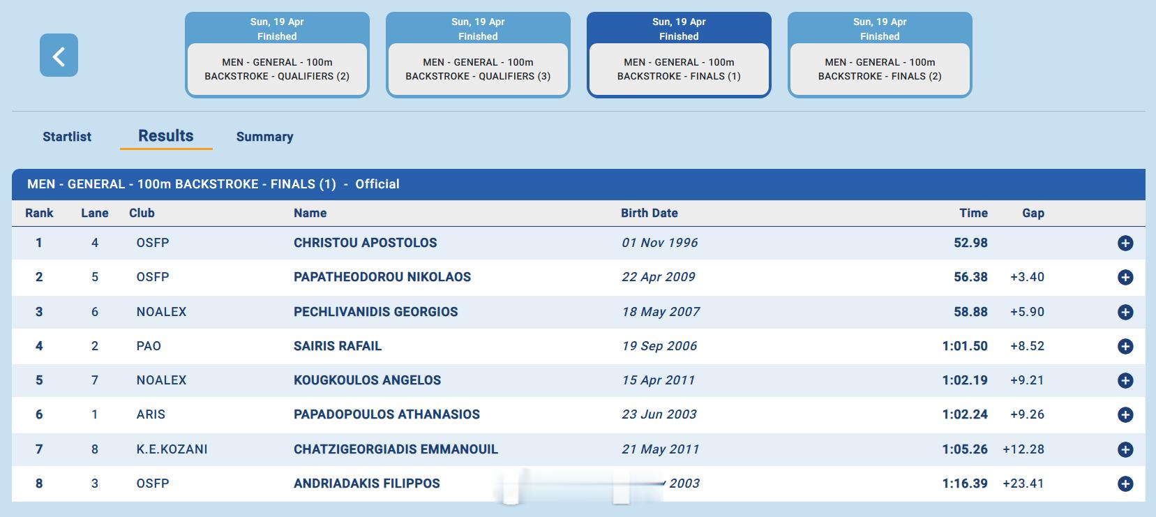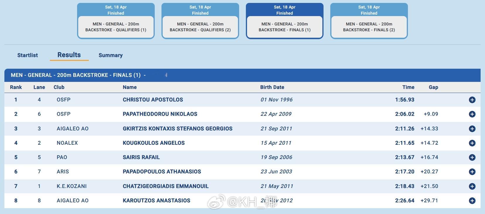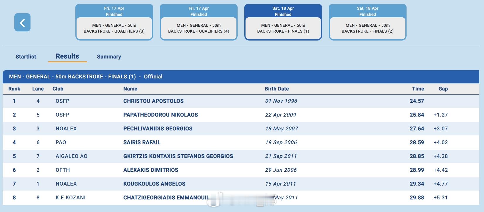 🇬🇷Faros-Elena Sairi(4.17-19)Apostolos Christou50仰:24.57100仰:52.98200仰:1:56.93