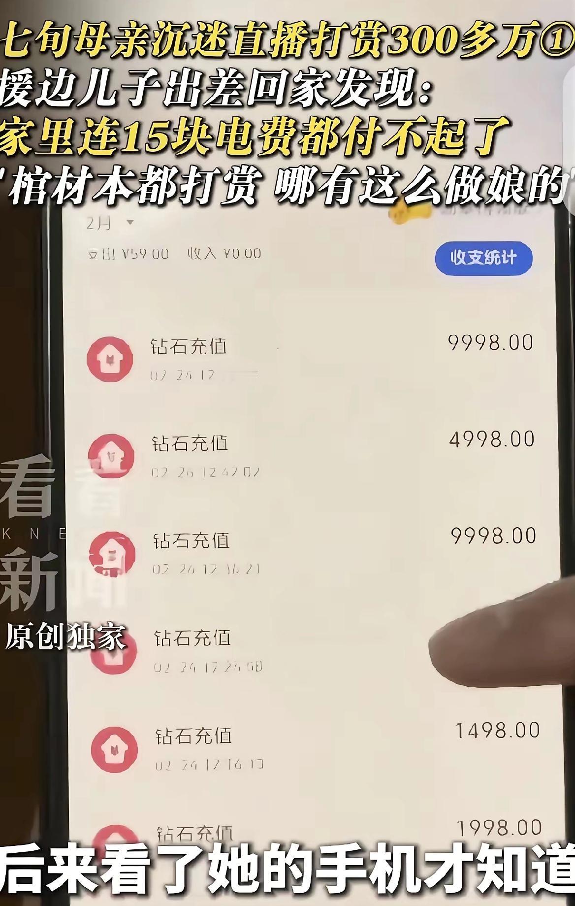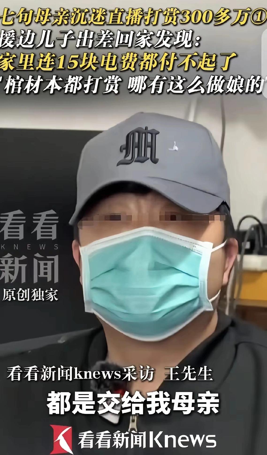 上海援边男子回家懵了:336万救命钱被母亲打赏主播,钱没了家也塌了! 谁能想到上海援边小伙攒20年血汗钱,竟被70岁亲妈半年造光?上海王先生常年在西部边陲支援,家里336万棺材本、救命钱,全被老母亲砸给了俩30岁主播! 他平时连买棵青菜都要货比三家的老妈,突然迷上直播PK,就像着了魔。一开始只刷小礼物,后来为了让主播赢,两三千块的“桃花岛”一刷就是三四个,每月5000多养老金根本不够,儿子的积蓄半年见了底。 更离谱的是,俩主播连她面都没见过,就靠一声声“阿姨”哄得她掏心掏肺。等王先生回家发现电费都交不起,查完流水直接傻眼,老妈还盘算着退休金继续刷!带去医院查,抑郁发作加焦虑,投诉报警全没用,钱打了水漂。 说到底不是老人傻,是空荡荡的家里,主播的虚情比儿子的陪伴暖啊。要是你家有这种情况,能劝住家里老人吗?
