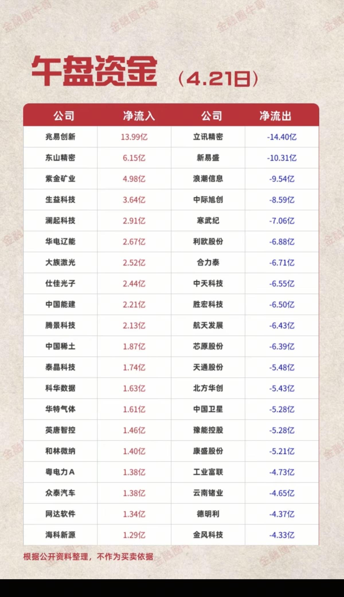4.21周二 主力大资金 抢筹出逃TOP20 资金抢筹: 氦气、工业金属、复合集体流、鸡肉、稀缺资源、光刻胶光刻机、PCB、核力发电等资金流入。 资金出逃: 网络安全、虚拟机器人、信创、电子身份证、数字货币、熔盐储能等资金出逃