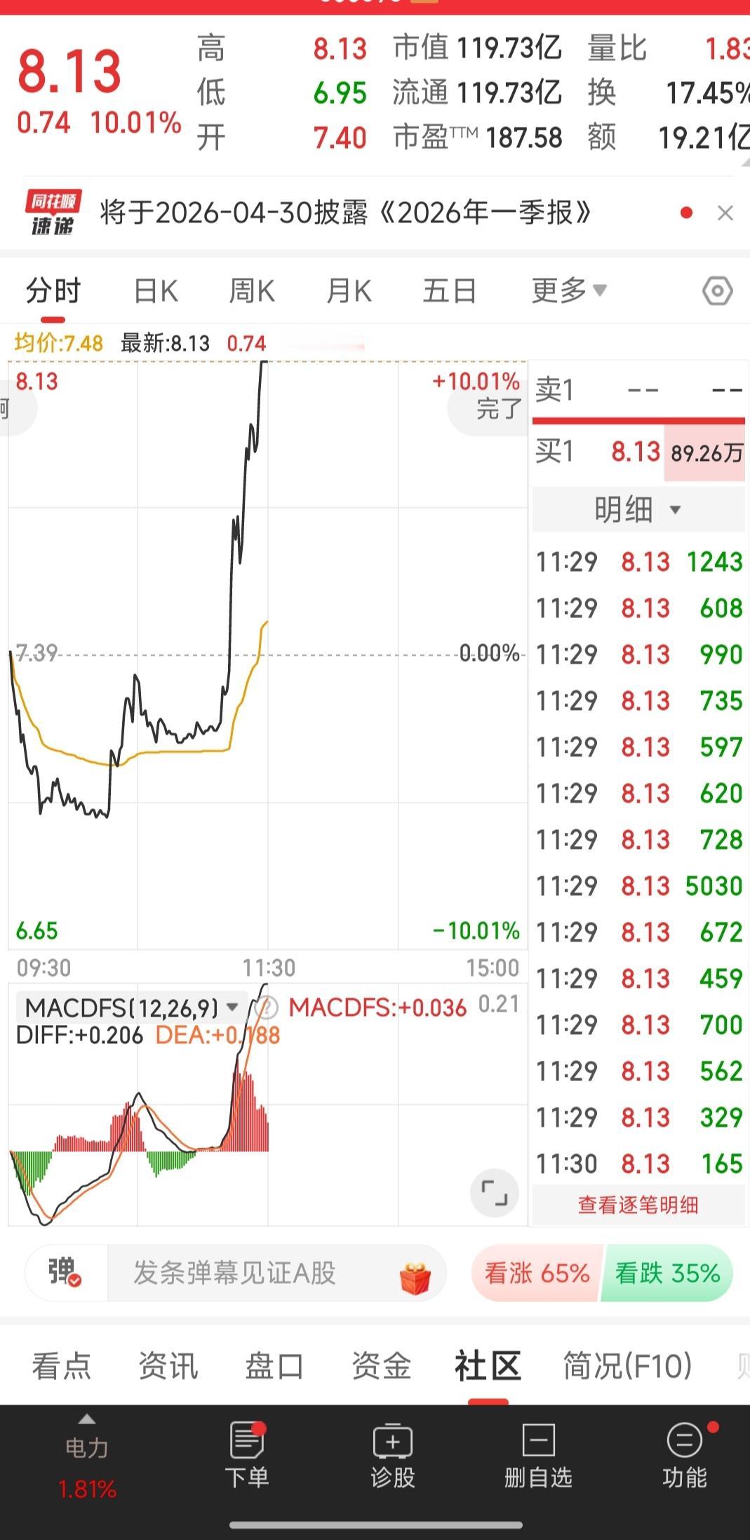 这个票我承认我上午负5个点的时候卖了,但愿赌服输卖了就卖了,现在涨停了你找谁说理去?炒股说来说去还是心态的问题,大家有关注我微头条的就知道,我在早几天就已经进了这支票,买了当天就亏了5个点,这几天也是不痛不痒的上下震荡,就在今天上午我再也熬不住了!今天上午开盘直线下跌,有个负5个点的洗盘,在亏损八九个点的时候我想到的是及时止损卖了坚持五六天的票。后面接近午盘收盘,他也不知道抽了哪根风,突然以90度直线的方式拉涨停,短短几分钟相差15个点换成谁都受不了!我觉得主力很会琢磨我们散户的心态,他们知道打压到什么时候散户会熬不住,这个时候他们就以小单的方式收集你廉价的筹码,最后来个出其不意的暴力拉升。现在也是后悔当中,想想如果没卖那该多好,最起码不用亏钱还能吃到一点肉,可是世界上没有后悔药,只能偷偷的躲在无人处抽自己几个耳光!