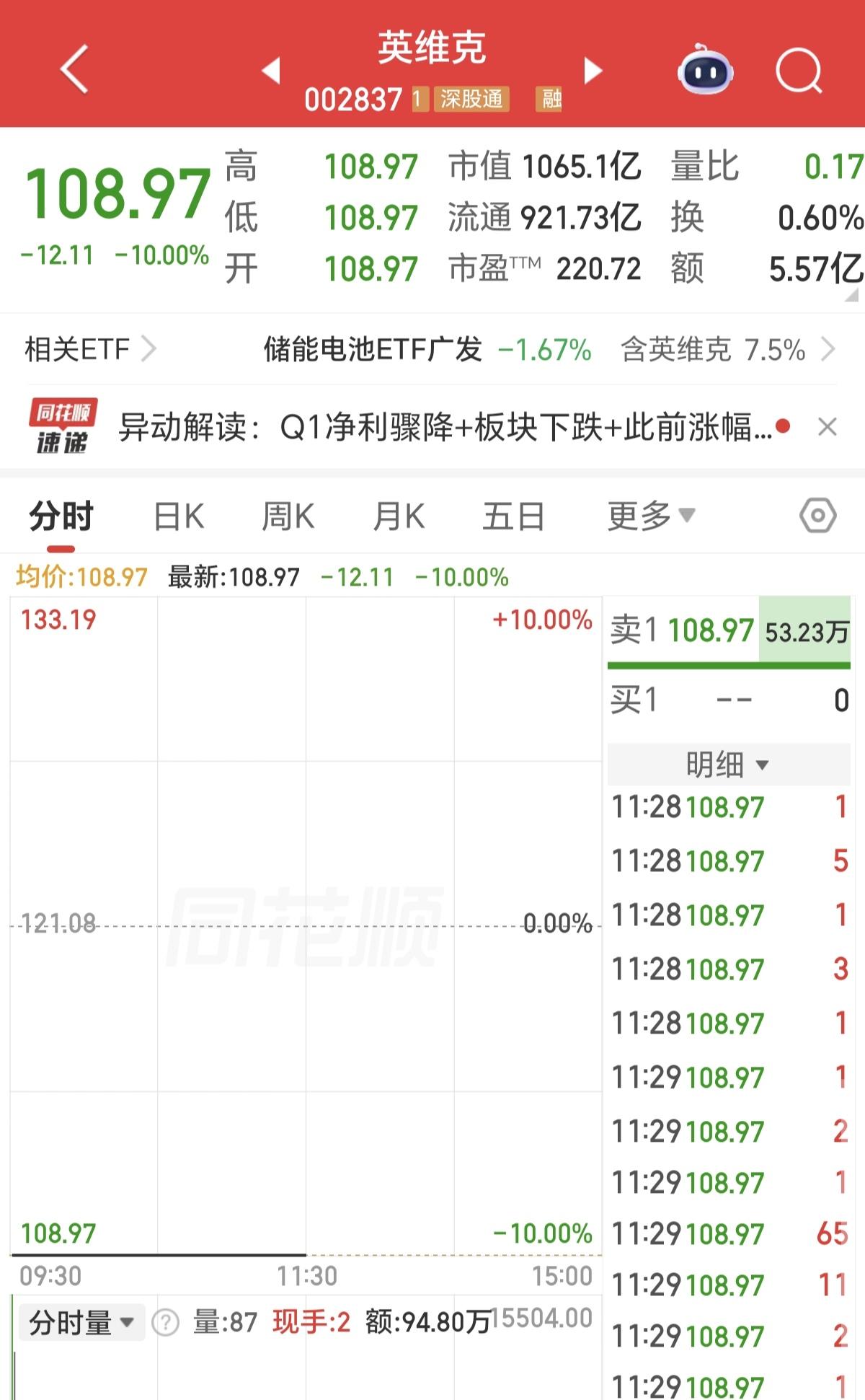 市值千亿的龙头一字跌停,说的是谁,说的就是英维克,这家2026年第一季营收入才11.75亿元的公司,是怎么做到市值超千亿的,全是靠炒作,来推高股价,今天的一字跌停,又套住了多少高位接盘的散户,而且今天是开盘就跌停,连跑的机会都没有,这样走势估计还得有几个跌停才出的来。A股的疯狂就在于能把一家没有业绩支撑的公司炒上天来让散户来接盘。