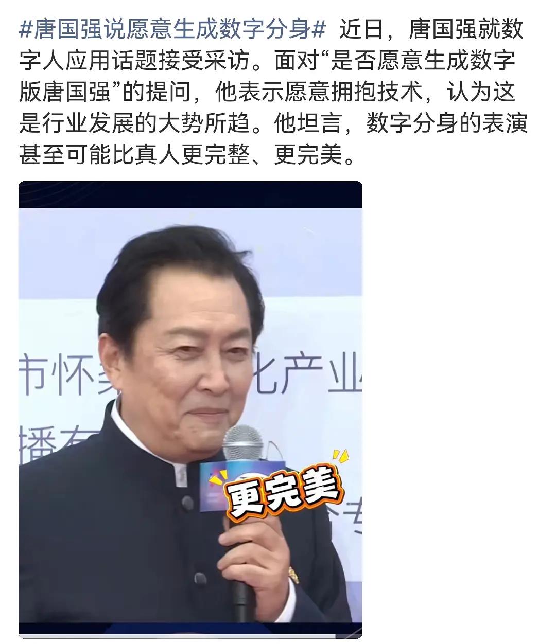 第一个公开支持生成ai分身的人出现了,竟然是老一辈的唐国强! 可能因为他现在不演戏了,ai影响不到他? 但我觉得他说的没错,演员本身也就是演,是一种模拟,有些演员演的还很差,在我看来这两种可以共存,喜欢看AI剧的看AI剧,喜欢看真人剧的看真人剧。 不过他去年很早时候有个综艺,就说ai很厉害了。因为他自己本来就很喜欢看网友制作的诸葛亮玩梗视频。