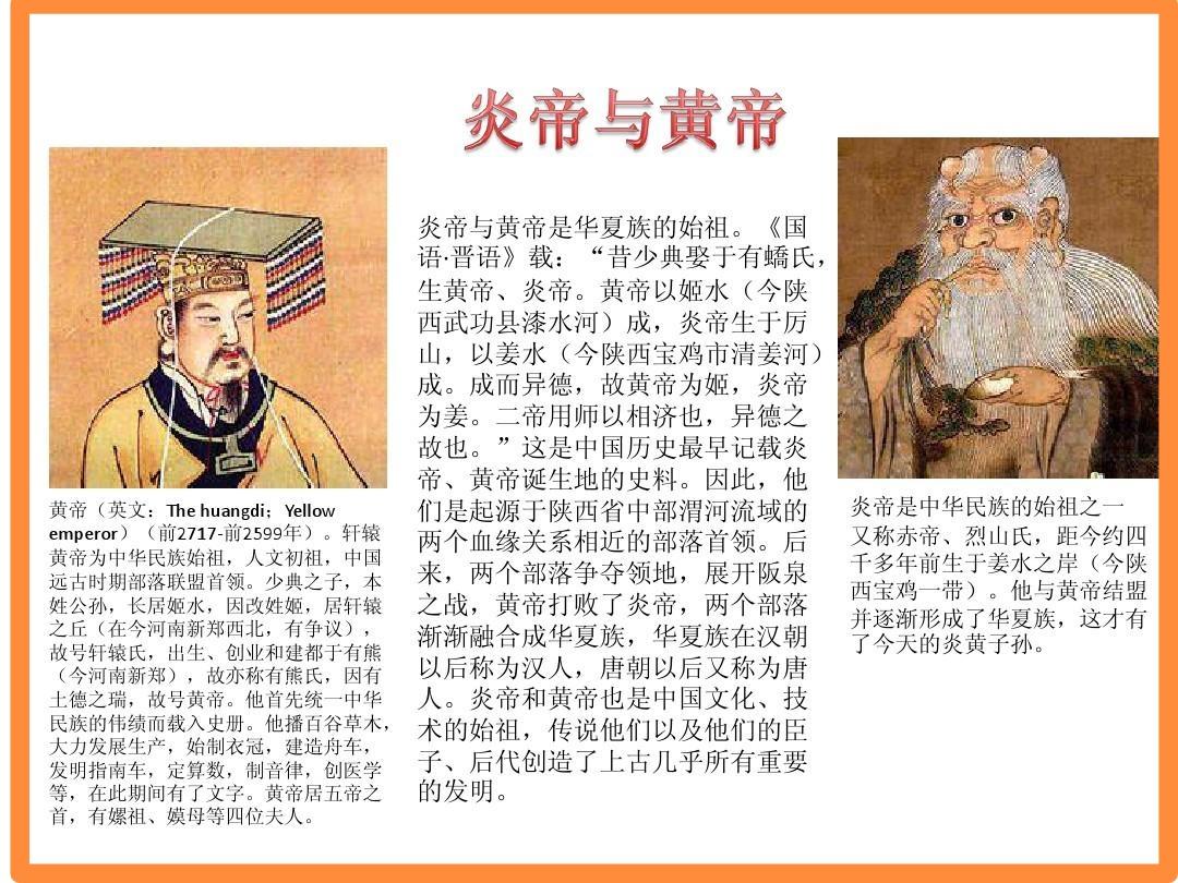 炎黄子孙:看一看你是黄帝子孙还是炎帝子孙 大家经常说,我们是炎黄子孙,这是一种合称与通称。其实,炎黄子孙,各有所指,分别是炎帝子孙和黄帝子孙,也就是说,我们华夏儿女大多数源出炎黄二脉,这从姓氏上便知: 先看黄帝一脉—— 本源姓氏:姬 衍生代表姓氏: 张、王、李、刘、杨、周、吴、郑、孙、胡、朱、林、郭、何、高、罗、唐、韩、曹、邓、梁、谢、宋、唐、董、萧、程、柴、蒋、卫、鲁、魏、韩等 再看炎帝一脉—— 本源姓氏:姜 衍生代表姓氏: 吕、许、谢、齐、高、卢、崔、丁、纪、赖、焦、邱、丘、贺、骆、晏、易、柯、聂、查、申等 从姓氏数量看—— 黄帝嫡系本源姬姓,由姬姓直接衍生出的姓氏达411个,占《百家姓》80%以上;炎帝嫡系本源姜姓,由姜姓直接衍生出的姓氏有100 多个,数量少很多。 从人口数量看—— 中国前几大姓基本上都是黄帝一脉,如王、李、张、刘、陈、杨、黄、周、吴等;炎帝一脉人口较多的只有姜、吕、许、谢、高、崔、卢、丁等。 原因就在于,上古时,黄帝打败了炎帝,打败了蚩尤,于是成为天下共主,是华夏第一共祖;炎帝部落成为联盟配角,处于从属地位。后来,黄帝后裔建立了周朝,周天子大封诸侯,姬姓子孙遍地开花;炎帝后裔主要集中在姜子牙的齐国等少数几个诸侯国,分支少,扩散范围小。 结果就是,黄帝一脉势力强,人口多,封国多,衍生姓氏多,后人就更多;炎帝一脉虽然起源早,但后来政治势力、封国数量、扩散范围小,后人就少很多。 华夏人文起源 华夏人祖 华夏炎黄大帝 华夏黄帝 华夏炎帝