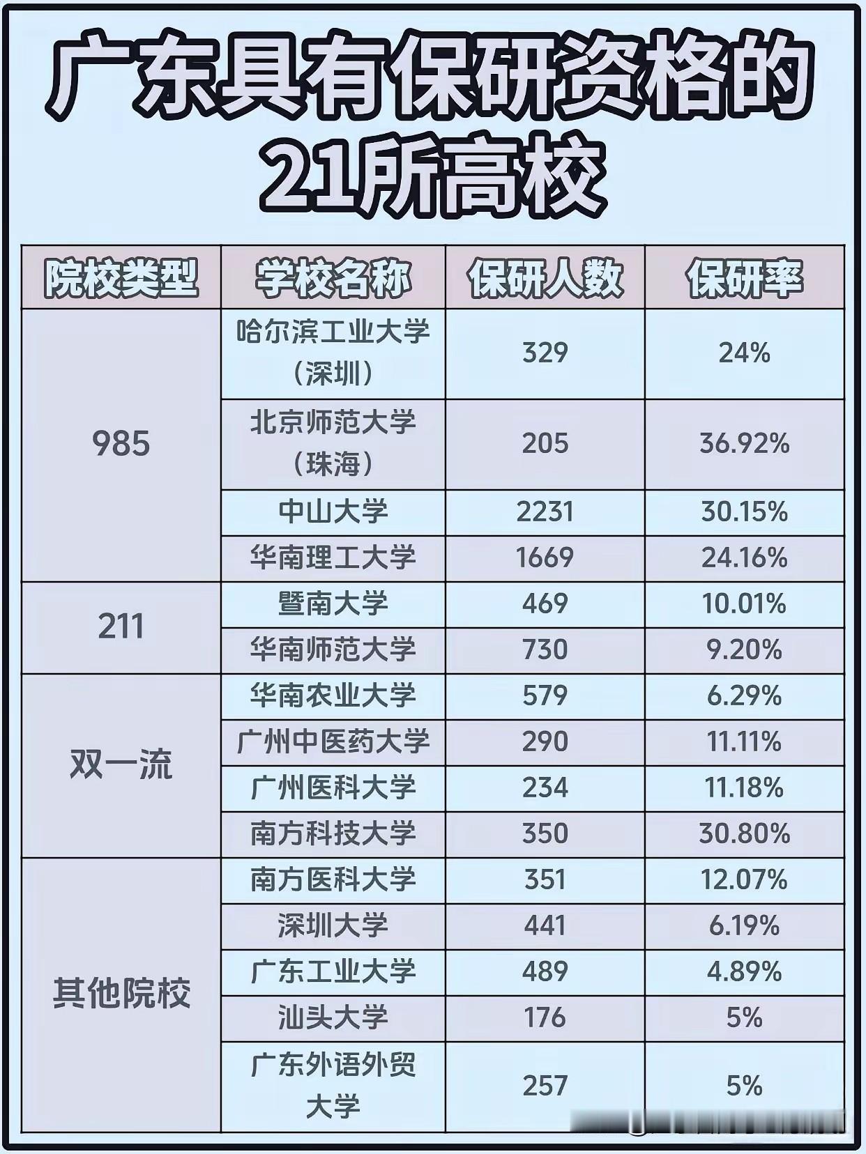 2026届广东省21所高校保研率,北京师范大学珠海、哈工大深圳、南方科技大学、中山大学,四所高校保研率超过30%。两所211高校华南师范大学、暨南大学,保研率均未超过10%。保研需要从大一到大三都要努力,绩点成绩排名是获得保研资格重要指标。