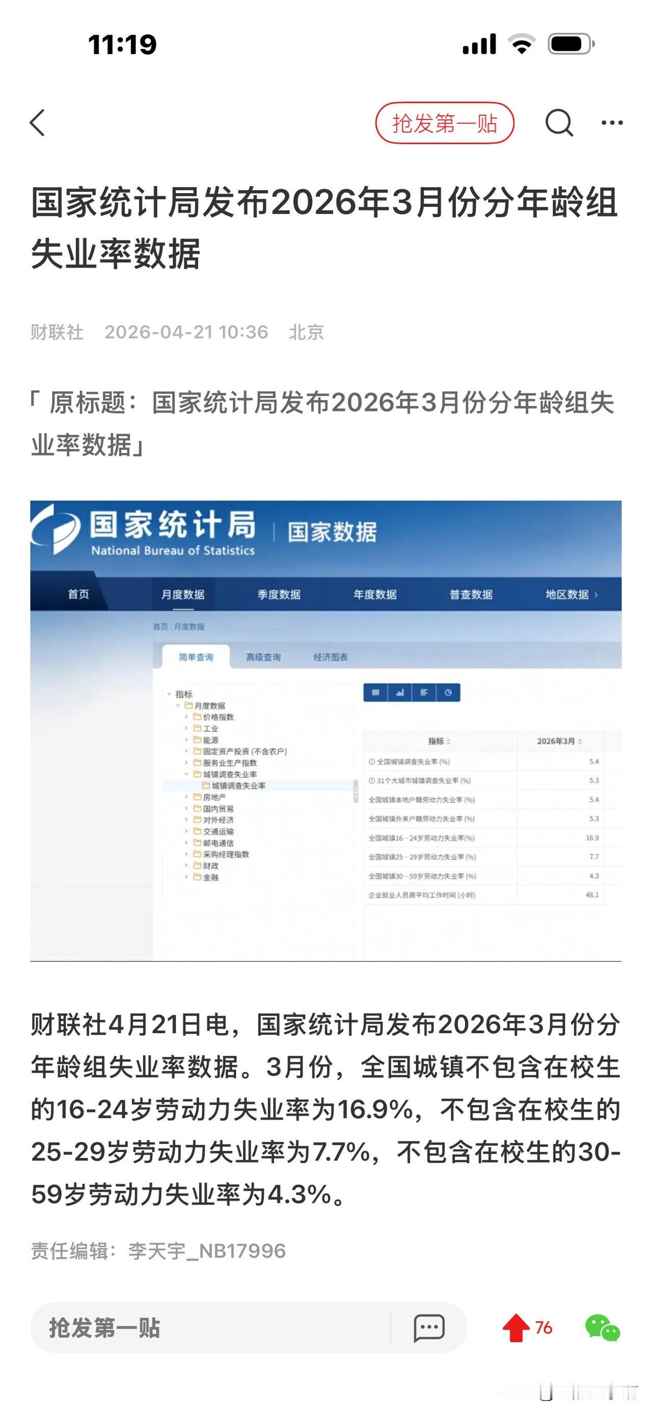 全国哪个年龄组失业率最高? 国家统计局发布最新数据, 结果是:越年轻,失业率越高! 近日,国家统计局发布了2026年3月份分年龄组的失业率数据: 16-24岁劳动力失业率是16.9%, 25-29岁劳动力失业率是7.7%, 30-59岁劳动力失业率是4.3%。 (以上百分率均不包括在校学生) 看看上面的数据,越年轻越找不到工作或不愿意去工作的人更多,这其中肯定有被动失业的,也有主动失业的。 主动失业的问题就有点大了。 这个群体有暂时找不到工作的,有正在观望是否进入职场群体的,也有可能,不少年轻一代在人生理念上干脆选择了躺平、不就业、啃老,感觉这样不是一个好趋势吧。 上面统计数据显示,30岁到59岁就业率最高! 因为随着年龄增长,加上被生活压力所迫,特别是人到中年,更多人愿意工作,或不得不工作,因为大多上有老、下有小,要挣更多的钱抚养他们,这个他们,也就是失业率最高的第一个年龄组16~24岁的年轻人,和老了的60岁以上的父母。 另外,这个30 ~59岁年龄组的群体不仅要供养自己,供养老小,还得为自己的未来打拼,为养老保障攒一笔钱,所以恐怕压力也是最大的吧。 他们也没法躺平,没法矫情,没法抛开一切,不管不顾,活得潇洒。 当然,各个年龄段的群体都不容易,大环境不大好,年轻人选择躺平或找不到工作更多也是无奈之举,他们这一代有他们的烦恼。 那么比较一下,你觉得哪个年龄组的更具有幸福感呢? 我个人认为,七十年代出生的人,现在还在工作,或许更具有幸福感,因为虽然上有老下有小,负担重,但大多有工作,毕竟有奔头,不像一些年轻一代的人茫茫然,找不到人生方向呢! 你认为是吗? [泪奔]