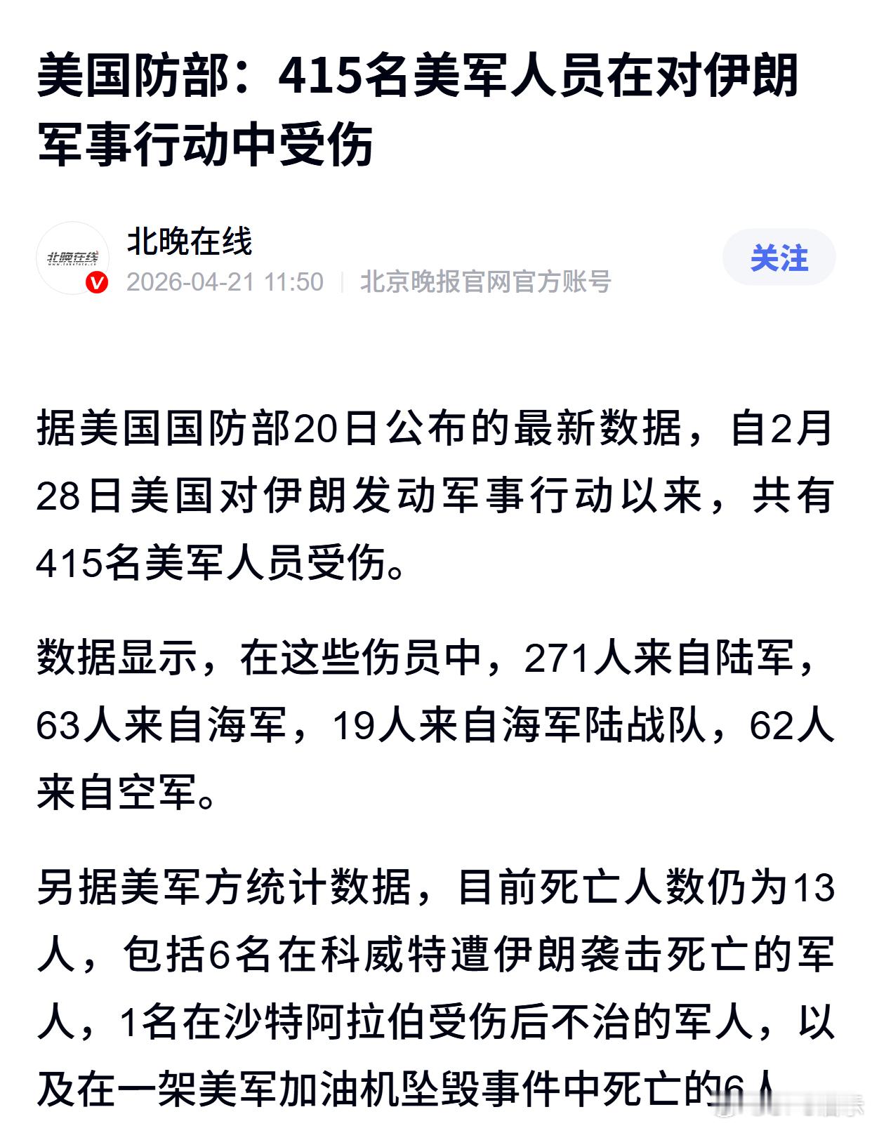 美国防部:415名美军人员在对伊朗军事行动中受伤