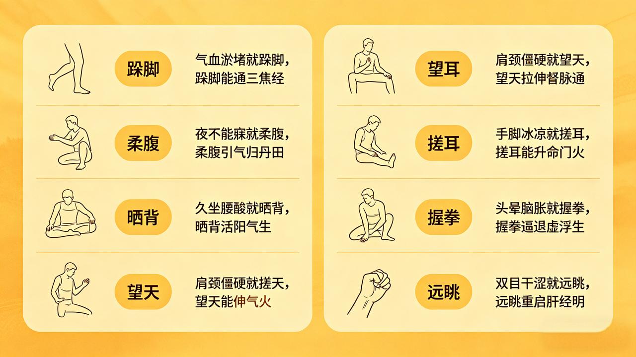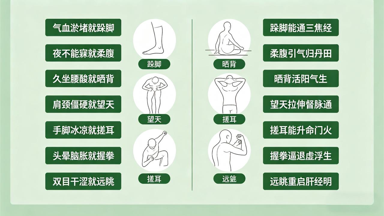 简易快乐养生口诀 (1)气血淤堵多跺脚,疏通三焦气血畅! (2)夜卧不宁勤揉腹,引气归元睡得香! (3)久坐腰酸常晒背,温养阳气身安康! (4)肩颈僵硬抬头望,拉伸督脉更舒畅! (5)手脚冰凉搓耳廓,温养命门寒气散! (6)头晕脑胀紧握拳,调气凝神精神旺! (7)双目干涩望远眺,养肝明目眼清亮!