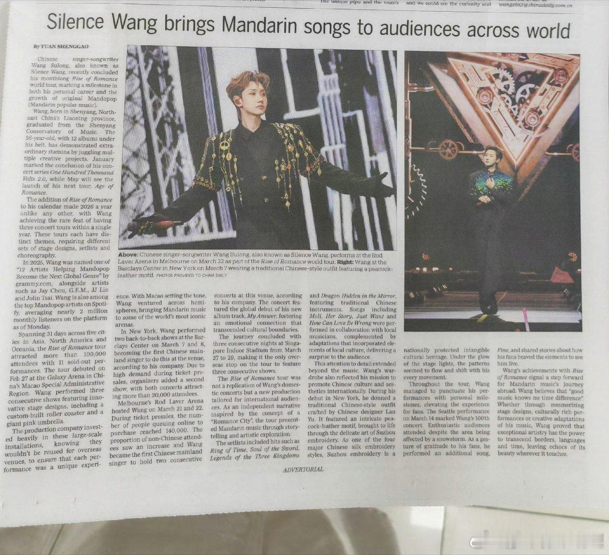 中国日报报道汪苏泷世巡纽约站不仅售罄还紧急加场,新加坡更是连唱三天,这票房号召力没谁了!泷哥用实力让世界听到了华语音乐的浪漫