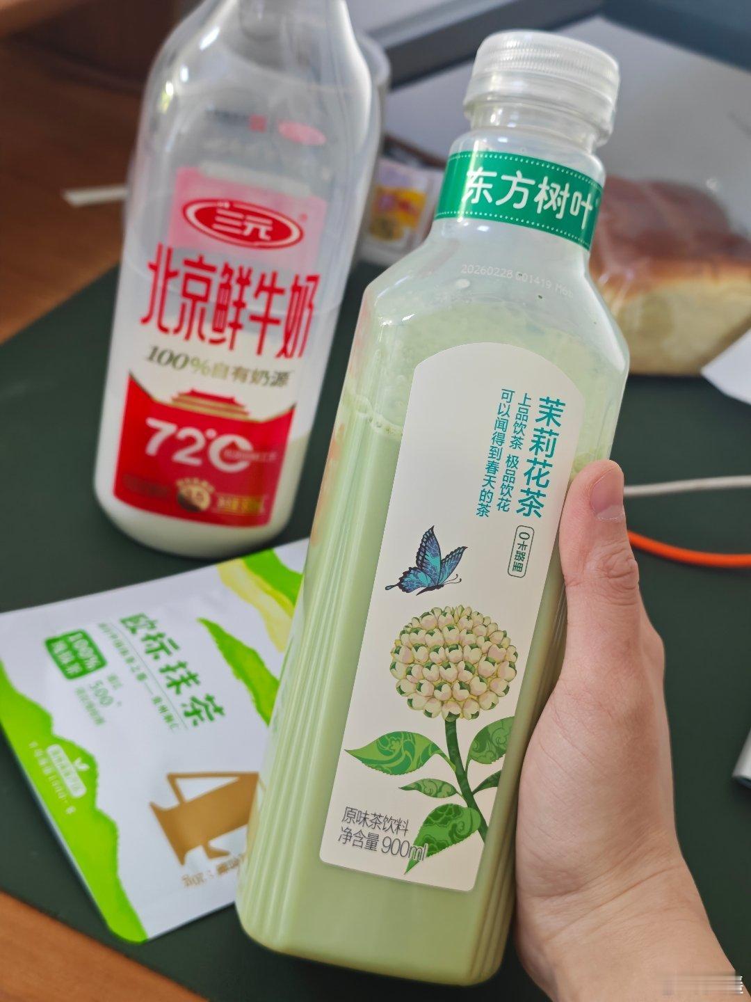 准备一瓶东方树叶,喝一半,加入牛奶,抹茶粉信我的,噗噗很顺畅