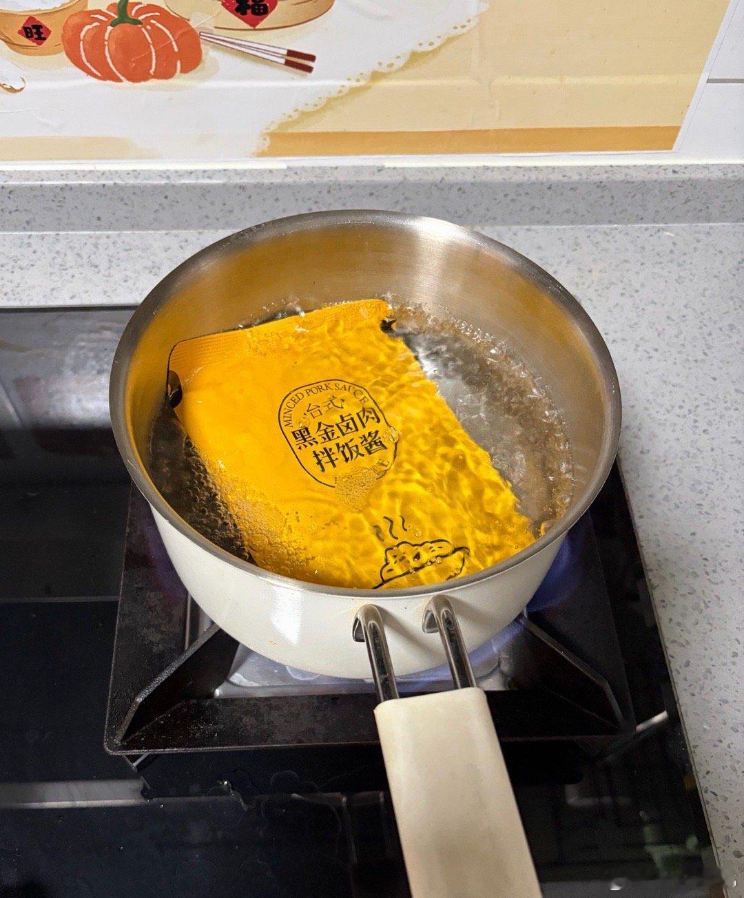 昨天家里那位说明天你在家吃卤肉饭吧,我说行啊。然后早上仍给我一包调料要说厨房白痴以后也饿不死啊,电饭锅里蒸一口饭,拌饭酱开水烫烫,煎两个蛋,这不比外卖强