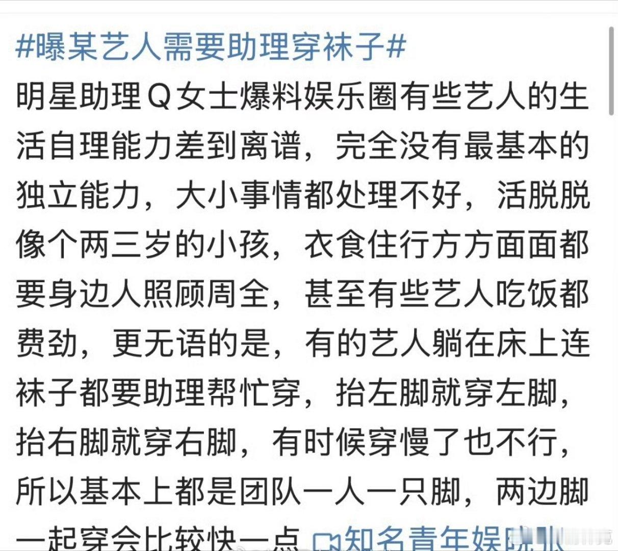 曝某艺人需要助理穿袜子也不是什么新鲜事了,类似的爆料早就有不少