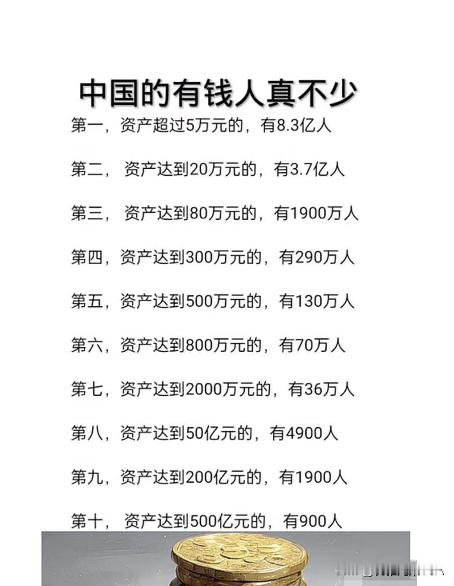 中国有钱人真不少!这组数据看得人直呼惊讶(´๑•ω•๑`)☞☞☞ 看完这组数据真被惊到了[钱][钱][钱]原来咱们身边藏着这么多“隐形富豪”! 资产超5万的,竟然有8.3亿人,差不多一半多中国人都达标了,看来大家手里多少都有点家底; 资产20万的有3.7亿人,这数也很可观,说明不少家庭能轻松应对日常开销还有富余; 再往上看更厉害: 80万资产的有1900万人,300万的有290万,500万的130万… 这些可都是实打实的“有钱人”了; 资产上千万的也不少,2000万的有36万人,50亿的竟然有4900人,200亿的1900人,500亿的900人… 这数字光听着就觉得震撼。 其实啊,资产多少只是个数字,日子过得踏实舒心才最重要。你现在在哪个梯队?评论区聊聊~ 财富数据