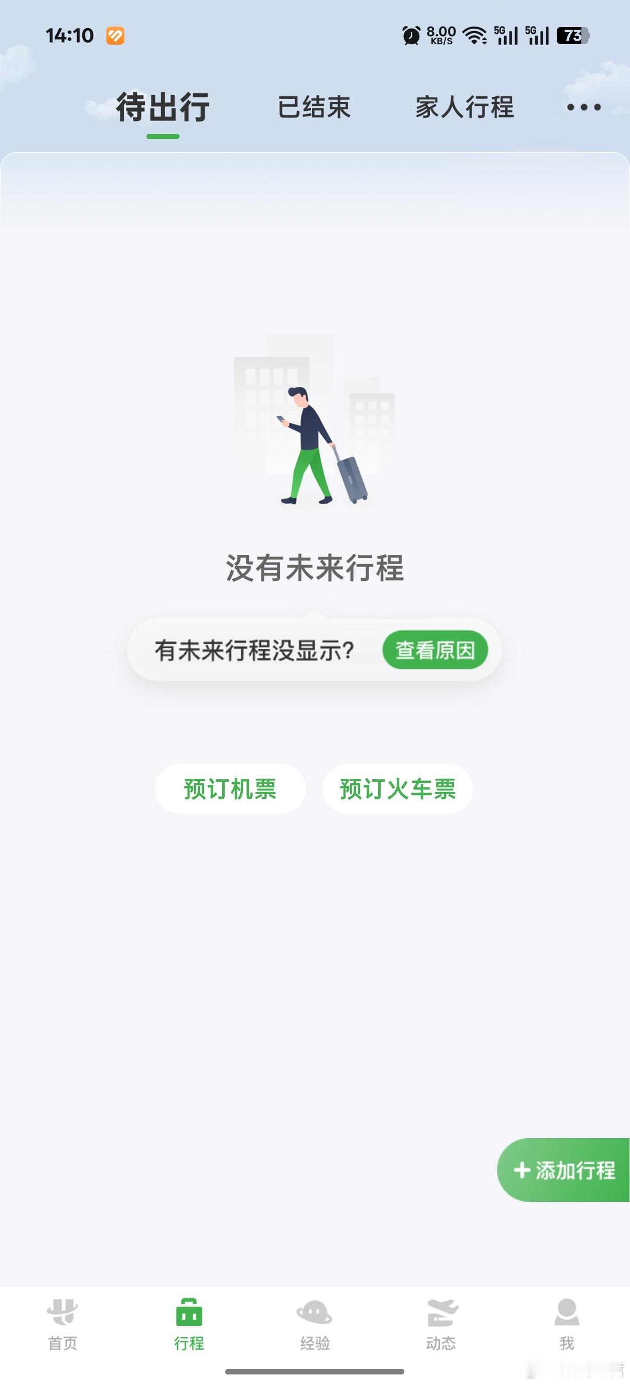 航旅纵横崩了 不是,上午刚用它值机完去北京的航班,这会儿直接崩了??打开一看待出行全灰,啥也刷不出来……有点离谱啊兄弟们,说实话这种时候要是有个zp电话打进来,跟你说航班出问题要改签啥的,如果不知道是app崩了的话,还真容易被带节奏,提醒一下最近飞的朋友多留个心眼~