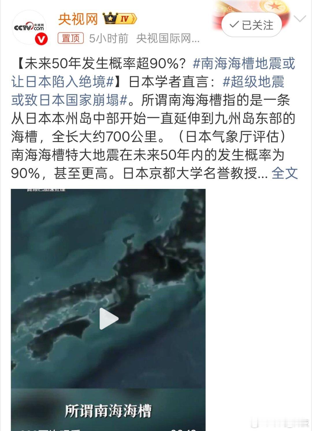 超级地震或致日本国家崩塌南海海槽特大地震50年内发生概率超90%,甚至更高。这意思是不是就是说会直接导致瘫痪,太恐怖了。
