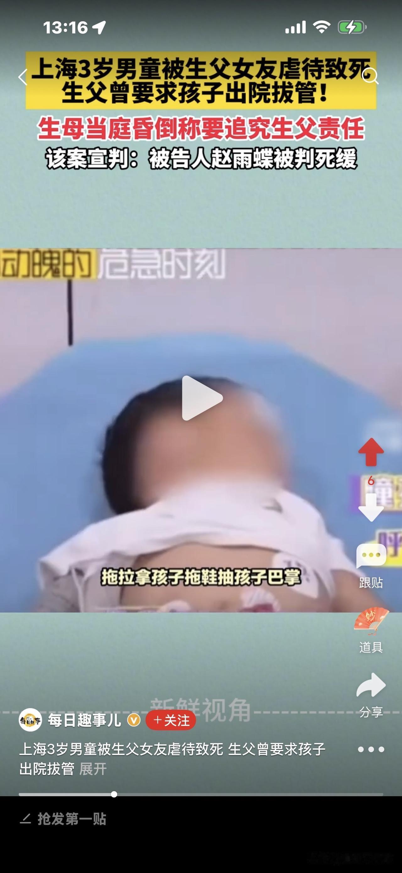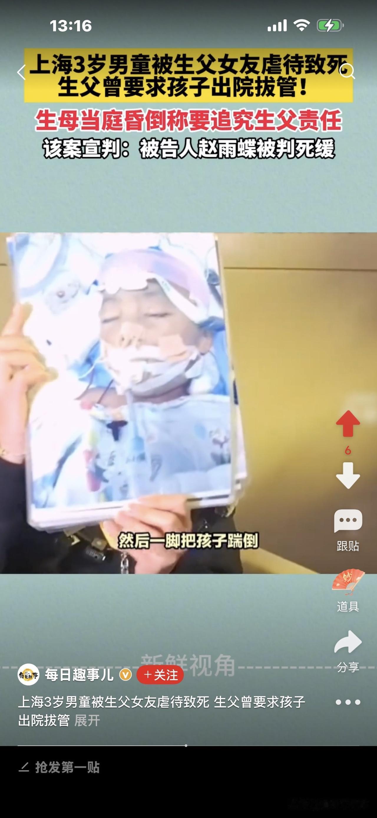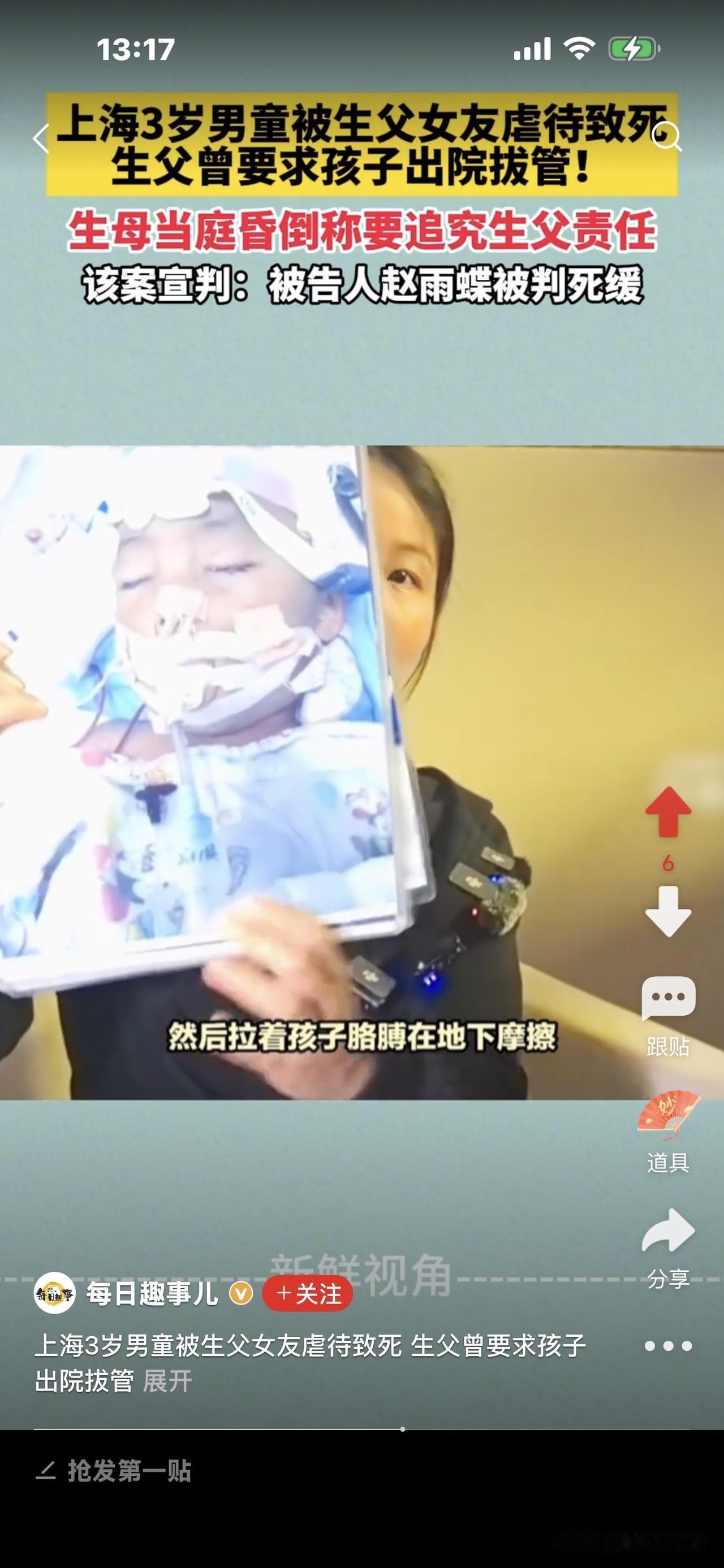 3岁男童被父亲女友虐待致死案! 细节披露:男孩在公园跑,赵雨蝶不满, 在河堤拎摔他,致其头部着地身亡。 生母说了赵雨蝶在公园的的罪恶行径:持续打孩子1小时左右,打后抱摔,之后拖拉,在地上摩擦。 简直惨无人道! 据悉,当时播放了一个小时(应该是公园里的监控视频),生母看见,儿子被前夫女友赵雨蝶先是用各种器具或方式,轮番打他。 多惨呀! 想想一个成年人收拾一个手无寸铁的幼儿,多么轻而易举,占据优势,他要你死就死、要你活就活! 任凭男孩哭泣不止,她冷漠凌厉的表情无动于衷。 赵雨蝶打完还不甘心,又抱起男孩,猛掷地上,完全是往死里收拾。男孩本能地叫喊,喊痛! 赵雨蝶更加生气,抱摔还不解恨,她又拖拽男孩,拿他的小拖鞋抽打他的小脸,把他打得晕头转向,之后,又拿起树枝抽打男孩的身体。 此时,赵雨蝶像疯了一样,完全控制不住自己,最后又一脚猛把男孩踹倒,像拖着一个口袋,攥着在地上摩擦。 此时,男孩已经窒息了,昏死过去,遍体鳞伤,惨不忍睹! 生母说,看到这个视频的时候,脑袋一片嗡嗡响,全身难受,再也控制不住自己,怎么也要让赵雨蝶绳之以法,且认为前夫也有连带责任,把孩子从自己身边带走,却没有好好照顾他。 目前,赵雨蝶被判死缓。 当时问赵雨蝶为什么要打孩子,她说,自己就是控制不住要打。 我们说有爱心的人看见一只蚂蚁,一只小猫小狗都有怜悯心,为何赵雨蝶会对一个幼童恨之入骨,想致他于死地? 她说控制不住要打,完全是理性,任意妄为,只因大人的感情纠葛就够迁怒于一个无辜的孩子,现在她罪有应得,要为她的过失付出代价。 记住,虐待儿童法律是严格的,别想逃脱,别想跑掉,一定要善待我们的下一代,让他们好好成长,因为他们是未来之花! [祈祷][祈祷]